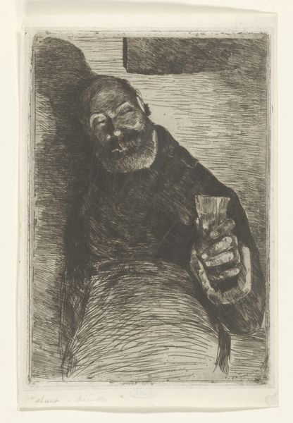 Editor: This etching, "Skraevende mand med hatten i haanden" or "Striding Man with Hat in Hand", created by Vilhelm Lundstrom between 1920 and 1923, possesses such a raw, unsettling energy. The figure’s posture, coupled with the frantic lines, feels incredibly anxious. How do you interpret this work? Curator: The historical context is key. Consider the social climate of post-World War I Europe, particularly in expressionist circles. The fractured lines and distorted figure reflect a broader sense of societal unease and the fragmentation of the individual. Do you see how the heavy shading almost imprisons him within the frame? Editor: Yes, definitely. It feels claustrophobic, like the figure is trapped in his own mind or perhaps by external forces. Is the museum setting part of this discussion? How the work is displayed? Curator: Absolutely. Think about the act of displaying this image in a public space, a museum. It offers a stage for societal anxieties. Its deliberate presentation encourages viewers to confront collective struggles within the safety of an art institution. The etching technique also becomes significant – a medium capable of mass reproduction, hinting at the widespread nature of these anxieties. It's not just one man's isolated feeling, but something possibly affecting a broader populace. Editor: That makes sense. So the choice of putting it in a museum actually almost validates this man’s pain? Curator: In a way, yes. Museums play a powerful role in shaping what we consider worthy of collective memory and attention. By exhibiting works like this, museums engage in a dialogue about social and political climates, validating personal experiences within a larger context. Editor: I hadn't considered the role of the museum in amplifying the work's message like that. Thank you! Curator: And thank you for helping unpack that meaning! The politics of imagery are ever-present.