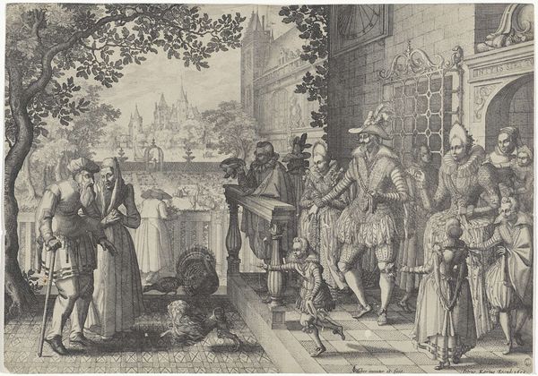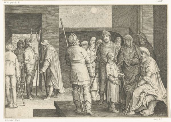 This drawing, "Christus en de schriftgeleerden (?)" by Moses ter Borch, likely created in the mid-17th century, captures a biblical scene with remarkable economy of means using pen in brown and gray ink. The composition pivots around a central gathering of figures rendered with loose, flowing lines, set against the backdrop of a simple architectural structure. Note how the artist employs light and shadow to give depth to the characters and their interactions. The dynamism of the lines creates a sense of movement. Structurally, the piece explores contrasts: the spontaneity of the sketch against the rigidity of the architectural elements. Such tensions invite us to consider the work not just as a narrative representation, but as an essay on form itself. The sparse use of ink directs our focus, encouraging contemplation on the essential elements. This work serves as a reminder that art's power lies not only in what is depicted, but also in how it is conveyed through the language of line, form, and space.