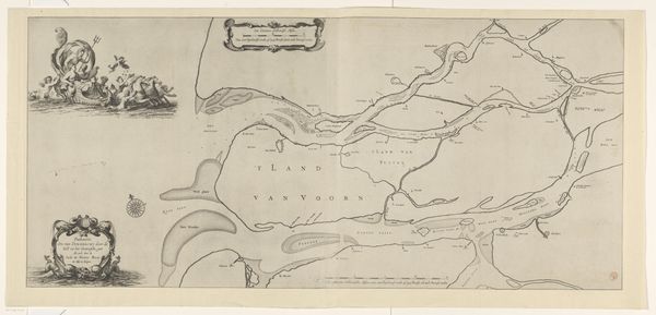 Curator: This detailed engraving, "Kaart van de Boven-Rijn bij Schenkenschans," or "Map of the Upper Rhine near Schenkenschans," was created after 1699, meticulously rendered in ink. Editor: Immediately, I'm drawn to the precision. It feels incredibly ordered, but also strangely serene, like a landscape captured under glass. The line work is so delicate! Curator: It’s the kind of image that highlights the intense labor involved in mapmaking. Think of the surveying, the engraving, and the printmaking all part of an interconnected system to produce such detailed documentation. Editor: Absolutely, but even as documentation, it carries an inherent artistic license. The mapmaker isn't just recording; they're composing, framing, interpreting, creating a worldview. See how the river dominates, it becomes the lifeblood of the composition and possibly also the region? Curator: Exactly! And consider the social context: maps like these served strategic purposes—navigation, military planning, colonial expansion. This isn't just about art; it's about power. We see how a seemingly neutral depiction is intrinsically linked to material interests. Editor: I'm sensing both authority and vulnerability in it. Knowing this piece reflects Dutch Golden Age cartography, there's that potent push-pull between asserting dominion over a landscape while still being so intimately reliant on its forces and offerings. Curator: The Baroque influence certainly speaks to that dynamic tension, doesn't it? It balances precision with the more expressive qualities inherent in ink drawing. And if you consider the consumption of these maps—displayed in homes of merchants or military strategists—it underlines how art functions as both a tool and a status symbol. Editor: Yes, seeing the sharp contrasts between order and flowing elements creates such visual interest, it has me thinking about how something can be simultaneously an attempt at mastering nature while being humbled by its scale and indifference. Fascinating. Curator: A useful lens, indeed. It provides a material understanding of production, utility and dissemination. Editor: Well said, I must admit that even its implied textures captivate me on some deeply poetic level, and I suppose I'm left with such an urge to imagine myself wandering that space and time.
