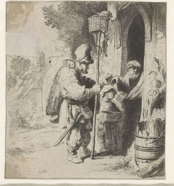 Curator: Look at this etching by Adriaen van Ostade, created between 1647 and 1652, titled "Brillenverkoper en een oude vrouw," or "The Spectacle Seller and an Old Woman." Editor: My initial impression is one of stark contrast. The composition seems crowded, almost claustrophobic, yet the fine lines create an open, airy feel. It's a very busy little world! Curator: Absolutely. Ostade masterfully uses etching to depict a common scene, yet the details hold so much cultural information. Note the spectacle seller, a somewhat itinerant figure, offering his wares to an elderly woman peering from her doorway. Editor: Yes, the woman seems to be the focal point. I wonder what spectacles represented in 17th century Dutch society. It suggests not only the natural process of aging, but a degree of prosperity perhaps? Illiteracy was rampant, so this assumes she could read or had other close-up tasks? Curator: Indeed! Spectacles in Dutch Golden Age paintings can symbolize knowledge, wisdom, but also vanity or declining faculties. Consider also that images of everyday life had their place in larger artistic and marketing worlds as prints increased and spread. Editor: So the print acts as an important vehicle into social dynamics? There's a second face looming behind her... Curator: Another intriguing presence, obscured in shadow. It amplifies the sense of mystery. Notice too, the younger girl standing by with a basket; likely family members, involved in the transaction. Ostade is capturing something fundamentally human, that process of generational transfer through object relations. Editor: I'm fascinated how the setting itself acts as another character, and this ordinary activity highlights themes beyond its surface: family, trade, perhaps the shift to the mercantilist marketplace—a real turning point for the social roles available at the time! Curator: Precisely. Ostade provides this fascinating portal to probe deeper. Each stroke on the copperplate offers an enduring, vivid moment within a culture so far removed. Editor: Indeed, spending time with this humble image enriches our understanding about this cultural legacy of early commerce in the Netherlands.