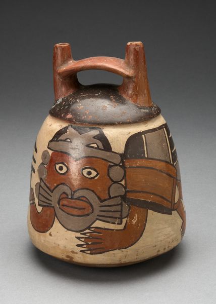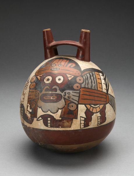 This ceramic double spout vessel depicting a costumed figure wearing a feline mask was made by the Nazca people of ancient Peru. The Nazca were renowned for their intricate textiles and ceramics, which often depicted complex mythological and religious imagery. The feline, such as the one depicted on this vessel, was a powerful symbol in Andean cultures, associated with strength, agility, and the supernatural. It would have been important within the ritual life of the community. The vessel's design and function suggest that it was likely used in ceremonial contexts, perhaps involving the consumption of liquids with ritual significance. The double spout and bridge handle are characteristic of Nazca pottery, allowing for easy pouring and sharing during communal gatherings. Archaeological research, combined with ethnohistorical sources, helps us to reconstruct the social and religious practices of the Nazca people, and to understand the symbolic meaning of objects like this vessel within their cultural context.
