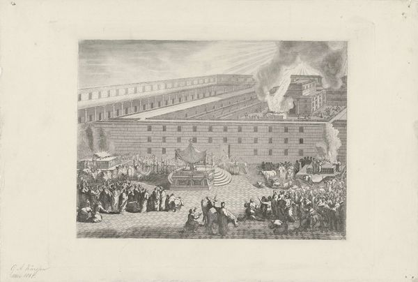 Curator: Here we have François van Bleyswijck’s engraving, “Inwijding van de Tempel van Salomo,” or "Dedication of the Temple of Solomon," created in 1727. It’s currently held at the Rijksmuseum. Editor: My first impression is dominated by the line work; it is incredibly detailed. Look at how the crosshatching defines the architecture and creates volume on the figures! There's almost a sense of precision that verges on the obsessive. Curator: Absolutely. Considering the historical context, Bleyswijck's portrayal transcends mere architectural documentation; it's steeped in political and religious implications. We see not just a temple, but the symbol of a covenant and nation-building exercise. Editor: Focusing on the composition, notice how the artist employs a structured architectural perspective, giving way to what appears to be dynamic and emotive scenes of people seemingly bearing witness to some dramatic act. Curator: It's fascinating how this composition subtly reinforces social hierarchies, isn't it? Solomon, enthroned and elevated, embodies patriarchal authority while the masses enact sacrifice, simultaneously displaying piety and allegiance. The engraver even includes different social classes represented by how far away people are positioned in relation to Solomon and the building. Editor: Yet within the architectural precision, I am curious about the use of fire and smoke which adds depth, disrupting an otherwise systematic scene. Curator: Indeed. I’d also venture to interpret that rising smoke not as purely textural or atmospheric but linked to broader themes of divine presence and sacrality that run deep through artistic depictions of political, ethnic, or religious consecrations of power. Editor: Interesting. Considering that the focal point directs attention to details regarding sacrifice, what message is being projected onto viewers regarding self sacrifice, whether social, familial, or economic? Curator: Exactly. Perhaps Van Bleyswijck hoped to invite deeper reflection on contemporary notions of state, sovereignty, and religious life through the prism of history. Editor: Well, reflecting on my side, examining its visual intricacies has opened my mind to new interpretive dimensions I might have overlooked! Curator: Indeed, for me too. By positioning the engraving within its historical context, we are challenged to address not just visual form but also ideological functions behind works such as these.