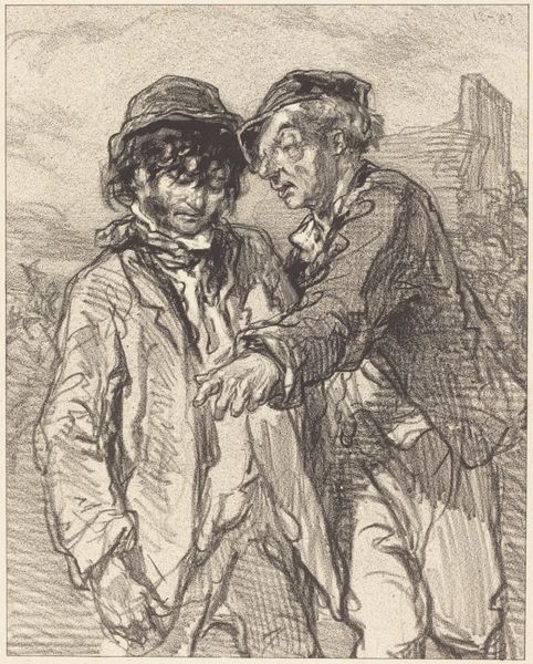 Editor: This charcoal drawing, "Twee heren in gesprek," by Cornelis Stephanus Roos, made sometime between 1855 and 1882, depicts two men in conversation. I find the loose linework quite charming, and it captures a specific social dynamic. How do you interpret this work? Curator: Well, looking at this, I'm struck by the historical context. It invites us to consider the societal norms surrounding masculinity and social class at the time. These men, likely middle or upper class based on their attire, are engaging in a dialogue, but what power dynamics are at play? Is one man seeking approval, or perhaps negotiating a business deal? What can this intimate scene tell us about a broader socio-economic system that might privilege their discussions over others? Editor: That's fascinating. I hadn't considered the power dynamics so explicitly. I was more focused on the individual interaction. Curator: The individual interaction is important. However, zooming out and examining the historical and social fabric allows us to understand the structures that influence even seemingly personal exchanges. What is unspoken is often as important as what's visible. And what voices are missing in this representation? Considering the drawing's context, who is excluded from this dialogue? Editor: So by considering who is not represented, we gain a deeper understanding of what the artwork is actually conveying, and whose voices were amplified during this historical moment? Curator: Exactly. By looking at art this way, we open ourselves to critiquing the structures of power that continue to influence contemporary society. Editor: This has really changed the way I see the drawing. Thank you for that shift in perspective. Curator: It's in these kinds of considerations that we may begin to think differently, to feel differently, and perhaps act differently in our lives and social contexts.