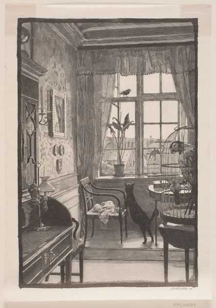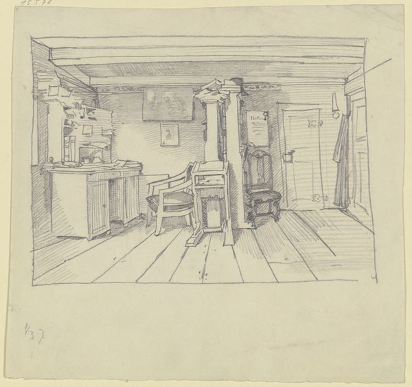 Curator: It’s immediately striking, isn’t it? Almost like a stage set waiting for the players to arrive. Editor: Indeed. We are looking at Joseph Pennell’s 1912 ink drawing, "The Dining Room, Stenton.” Pennell, though American by birth, spent much of his career chronicling the architecture and daily life of Europe, often favoring London. But this intimate scene is domestic, quite different. Curator: The details are amazing—the shadows give a depth beyond a simple sketch, though the penwork is minimal. A formal, highly polished table seems to be the focus. And the composition definitely contributes to the feeling of expectancy, as though guests will shortly appear. Note the highly symmetrical fireplace and place settings, balanced and timeless. Editor: Symmetrical indeed. This interior provides a glimpse into early 20th-century domestic life, when social gatherings centered around formal spaces. The artist captures not just the room but also the societal values attached to dining and entertaining. What meanings can be gleaned by exploring it now, in this specific museum? Curator: The mirror above the sideboard doubles the reflection of light; its position implies an interest in artifice, performance, the drama of life lived as much for show as for the self. We all, and I believe he's inviting us to be among them, watch ourselves enacting specific, assigned roles. Editor: Fascinating. Pennell's personal sketches give such a unique look into domestic life and culture. His works offer glimpses into forgotten spaces and values that remind us of the past’s lingering impact on our present. I particularly love the glimpse of fire reflected in the surface of the tabletop. It's the only sign of movement here, though it flickers, too, just like an illusion. Curator: So do I. A final breath, before everything shifts. It's more potent and ambiguous than I initially thought. Thank you! Editor: The pleasure was mine. Another hidden chapter unearthed!