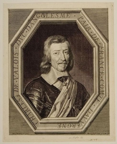 Jean Morin made this engraving of Charles de Valois, Duke of Angoulême. The image is constructed through carefully incised lines, creating a range of tones and textures. Morin would have used a sharp tool called a burin to cut lines into a copper plate. The depth and density of these lines determined how much ink the plate would hold, and thus, the darkness of the printed mark. Look closely, and you can see how Morin skillfully modulated the lines to depict the Duke’s face, armor, and the ornate frame surrounding him. This wasn't just about technical skill; it was about conveying social status. The Duke’s likeness, meticulously rendered, projects an image of power and refinement. Engraving like this was labor-intensive. It demanded precision, control, and an understanding of material properties. Prints like these served as important means of circulating images and ideas in the 17th century. They blur the lines between art, craft, and social communication.