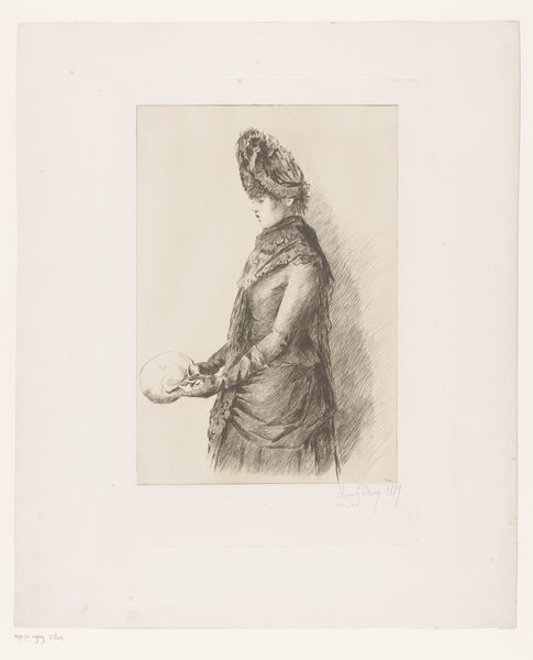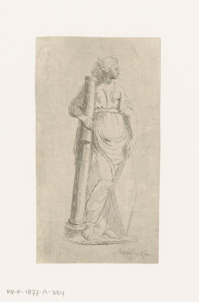 Curator: Here we have a drawing titled "Vrouwenfiguur met gebroken zuil en ruitvormig schild" by Bernard Eugène Antoine Rottiers. Created sometime between 1781 and 1858, it’s a pencil drawing on paper. What strikes you immediately? Editor: There's an air of melancholy surrounding this woman, despite the classical elements. She looks weary, perhaps defeated. Curator: The broken column and shield are symbolic. Broken columns frequently represented mortality, or even fallen empires, during this period. Shields speak to protection and perhaps the defense of certain principles. Editor: It feels more personal than political to me. Looking at her gaze, she is not engaged in active combat. She looks like she’s in mourning, and to me, her face speaks to an interiority, an exhaustion of being made to bear these historical burdens that you describe. Curator: I can see that. It’s interesting to note how the artist positions her. She's framed by these symbols, suggesting their inseparability. This era saw a real interest in the role of women and citizenship, which influenced art produced at the time. The sketch seems related to similar Neoclassical representations depicting female virtue and patriotic duty. Editor: But is it necessarily about *virtue*, or about the burden placed upon women? Notice the contrast between the idealised face and the realistic depiction of the hands. She is actually holding that pillar! The drawing complicates a straightforward reading of simple patriotic virtue, I believe. The work almost underscores the difficulty, maybe even the impossibility, of maintaining those ideals. Curator: I think there's merit to both interpretations. Academic art of this time certainly held specific didactic intentions. Consider also, though, how Rottiers places her slightly above us, conveying some element of enduring strength, even in ruin. Editor: Ultimately, I'm drawn to the tension between what she’s meant to represent and what the artist reveals about the cost of that representation. It asks us to consider who benefits from idealized notions of virtue, especially when they mask lived realities. Curator: A fascinating point. The beauty of historical analysis is that it allows us to see the layers, the intended messages, but also to be alive to what remains unsaid and open for interpretation. Editor: Precisely. I think this work allows us to ask necessary questions about gendered expectations of the time, as much as the politics of imagery during the artist’s lifetime.