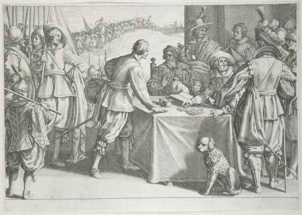 Editor: Here we have Nicolas Henri Jacob's "Treaty of Léoben," a lithograph from around 1822. It depicts a formal gathering, seemingly a negotiation or signing of some kind, with a palpable sense of tension in the air. What strikes me is the contrast between the figures, their postures, and the setting. What do you see in this piece? Curator: What I see is a visual representation of power and its performance. "Treaty of Léoben" is more than just a historical document; it's a meticulously crafted narrative meant to legitimize a specific political agenda. Consider how Napoleon is positioned – his hand gestures assertively over the map, embodying control. How do you think the artist’s choices reinforce or challenge existing power dynamics? Editor: Well, the composition definitely directs our eye to Napoleon. It seems he's meant to be seen as a dominant force, while the others appear almost as supporting characters in his narrative. Curator: Exactly! This piece actively constructs Napoleon’s image as a leader, yet it's crucial to acknowledge that such imagery often conceals the complex negotiations and power struggles behind the scenes. We should question whose perspectives are privileged and whose are erased in this portrayal. The treaty itself had huge impacts on the map of Europe and those who were living there, but we're presented with a clean narrative. Editor: That’s a great point. It makes you wonder about the individuals who were affected by the Treaty but aren't present in this depiction. Curator: Absolutely! We can analyze Jacob's print not merely as an aesthetic object but as a political statement. How does considering the historical and social context influence our understanding of the artwork? Editor: It really reframes it. It moves beyond just admiring the artistic skill, and makes you think critically about the story that's being told. Curator: Indeed. By questioning the narrative and digging deeper into the historical context, we reveal the multifaceted layers of power, ideology, and representation embedded in the art. Editor: This has totally changed the way I see history paintings! Curator: And that's the aim, isn't it? To ignite that spark of inquiry.
