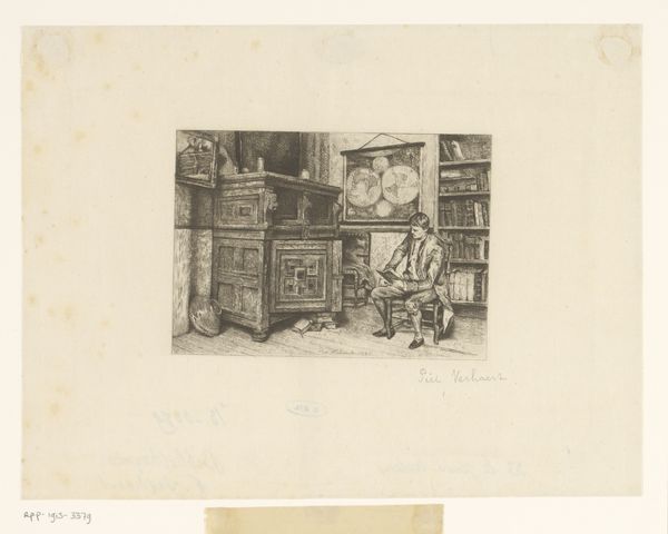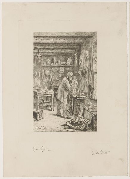 Editor: This is "Werkplaats van Josué Dupon," created sometime between 1874 and 1909, using etching and ink. The etching depicts a studio space; it’s really busy with sculptures, tools, and drawings. It seems quite intimate and detailed, making you wonder about the artist’s process. What do you see in this depiction of a workspace? Curator: What strikes me is how this print invites us to consider the artist's means of production. Dupon has not only created an image, but also left a visual record of the very labor that underpins his art. Consider the prevalence of sculptures in various states. Editor: You're right! The studio feels like a factory. Is this focus on production common for academic art of this period? Curator: It certainly speaks to the changing role of the artist. Etching, as a repeatable medium, opens avenues for wider distribution and consumption of images. It transforms art from a unique object into a reproducible commodity. Editor: I guess I hadn't considered the implications of printing itself as part of the "materials." The print feels much more like a democratic medium. Curator: Precisely. Furthermore, let us reflect upon the arrangement of the scene. How is Dupon subtly showcasing his wares and, in effect, his labor? Where does artistic 'work' start and the 'art' begin? Is he drawing our eye toward the material processes that go into creation? Editor: I'm really learning to see the art, but also the artistic manufacturing behind it. It changes my whole appreciation! Curator: Exactly! Viewing art through a material lens reveals not just the object itself, but also the intricate network of labor, production, and consumption in which it is embedded.