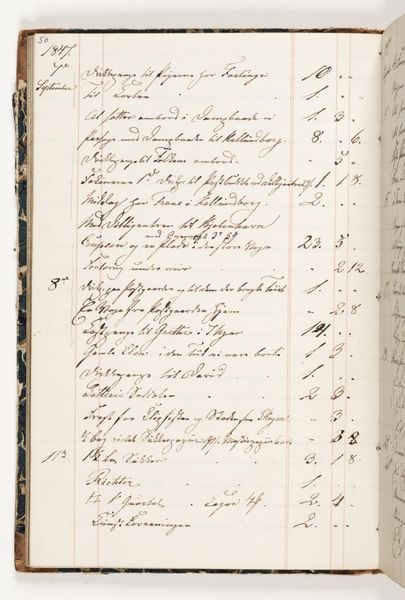 Curator: This artwork by Martinus Rørbye, simply titled "Regnskab 1847", made with ink on paper, provides us with insight into daily commerce in the mid-19th century. Editor: My initial impression is the intimacy conveyed through its small scale and dense inscription. It feels very immediate, almost tactile. Curator: Absolutely. Examining this ledger beyond its formal qualities allows us to see it as a cultural object reflecting societal norms and hierarchies. It offers glimpses into the economy of the time. The carefully inscribed entries provide context to understand the transactions and lives touched by this "Regnskab," illuminating socio-economic realities and the power dynamics implicit in even simple transactions. Editor: True, the neat rows and meticulous penmanship establish a structured, almost rigid visual rhythm, hinting at the orderliness of mercantile bookkeeping, and visually establishing both order and value. I can see that the subtle variations in the thickness of the lines bring a certain texture and depth to the two-dimensional plane, as well. Curator: The materials – ink on paper – contribute to the historical narrative as well, revealing the materiality of everyday life from this time period. Each notation offers small details, acting almost as data points within larger systems. Consider this account book as part of a broader material history that challenges the marginalization of such ephemera by connecting individual stories to widespread, documented societal practices. Editor: So, rather than merely dry documentation, you see the ledger as containing expressive form. These carefully drawn notations offer us today a graphic harmony which speaks, perhaps unconsciously, about organization and a balance in visual tension. Even though there is little physical action visible, the visual form, or graphic content, tells a fuller story through the medium itself. Curator: Precisely. What begins as financial accounting turns into evidence of its historical context, revealing deeper truths when decoded within the frameworks of contemporary society. Editor: I suppose when looked at it in that way, it changes everything about it from merely utilitarian accounting to an expression of culture itself. Curator: I'm glad we could offer that lens into how to view "Regnskab 1847". Editor: Yes, seeing the work from your perspective enriches my experience too!