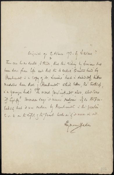 Curator: Gerrit Jan Michaëlis' "Brief aan Christiaan Immerzeel en de heer Van den Berg," likely dating from the 1840s, executed in ink on paper… What strikes you most about this intimate correspondence? Editor: The script, the very handwriting itself. It's like a glimpse into someone's thoughts frozen in time. I see the formal address, the expressions of gratitude… How do you interpret the significance of handwriting as a form of visual expression in this piece? Curator: Handwriting carries cultural memory. The specific looping and forms evoke the 19th century and hint at education, social standing, maybe even personality. Think of illuminated manuscripts—even functional text was a considered, symbolic art. Can you imagine what this letter, with its carefully chosen words and script, meant to the recipient? Editor: So, the way the letter is written is as important as what it says? Curator: Precisely! The flow and form, its imperfections even, reveal humanity. Calligraphy wasn't just about legibility, but communicating status, beliefs, and connection to heritage. A personal letter transcends its literal message; it becomes an artifact imbued with layers of social and emotional meaning. Notice, too, how the placement of the text itself echoes a certain elegance...what do you think this symmetry suggests? Editor: It makes the letter feel more considered, less like a casual note. I suppose everything, from the ink to the spacing, was carefully chosen to create a specific impression. Curator: Yes! The aesthetic elements, seemingly incidental, speak volumes about social convention and self-presentation. Editor: It is remarkable to consider the level of thought put into something as commonplace as a letter! It really elevates my understanding of it as a historical object.