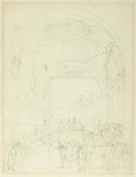 Editor: This is Thomas Rowlandson’s “Pantheon Masquerade,” a pen and ink drawing from the Tate Collections. The chaotic energy is palpable, but who are these people and what does it tell us about the time? Curator: The masquerade was a potent symbol of social fluidity, a space where identities could be shed and reformed, often satirizing the rigid class structures of the time. Do you see hints of transgression here? Editor: Maybe in the exaggerated costumes? It feels like commentary. Curator: Exactly. Rowlandson, working during a period of immense social and political upheaval, captured the masquerade as a site of both liberation and critique, holding a mirror up to the follies and pretensions of the elite. What do you make of that juxtaposition? Editor: I hadn't considered the political dimension so directly. Now I see the masquerade as a form of protest, or at least a release. Curator: Precisely. Art gives us such access into the past.