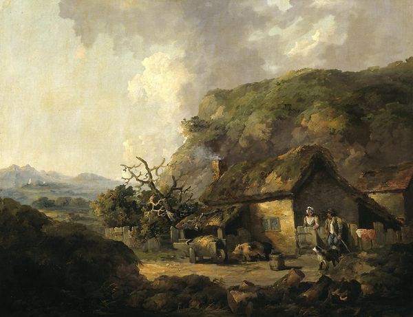 Curator: Thomas Cole's "House, Mount Desert, Maine" presents a seemingly simple scene. The composition and materials, though, speak volumes about 19th-century American ideals. Editor: It feels like a visual representation of the frontier myth: that cabin, small yet sturdy, nestled in the overwhelming expanse of nature. Curator: Precisely. The house, rendered with such deliberate detail in oil on canvas, becomes a symbol of human ambition and the American dream writ small against the backdrop of the sublime, represented by the surrounding mountains. Editor: I’m drawn to how the logs of the house have been carefully shaped; it's a testament to the labor required to establish a foothold in this landscape. The rough-hewn texture conveys the sheer effort involved. Curator: And the artist uses that contrast—between the raw landscape and the crafted home—to explore the evolving relationship between humans and the wilderness. It reminds us of the cultural values projected onto the landscape at the time. Editor: It’s fascinating how much a simple dwelling can signify. Curator: Indeed. Cole captures a fleeting moment in the ongoing negotiation between civilization and nature, rendered visible through a small house on the Maine coast.