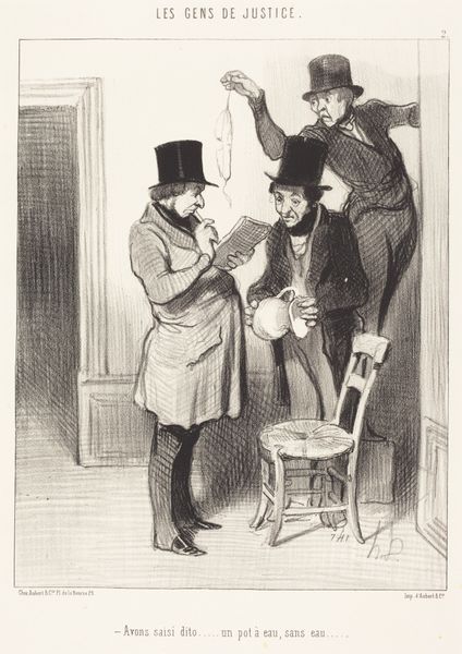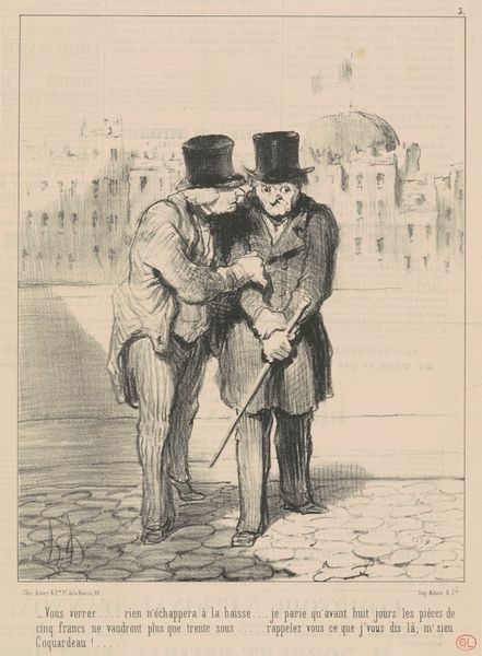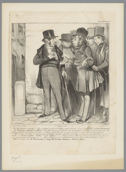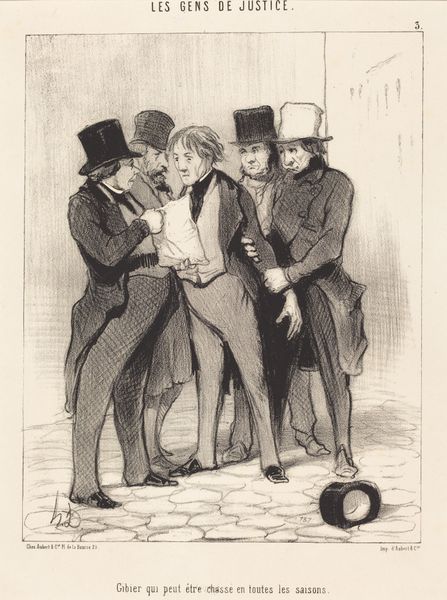Honoré Daumier made this lithograph, "Un Voyage d'agrément a Paris," with ink on paper. The image teems with dense, crisscrossing lines that create a dynamic yet unsettling scene. The monochromatic palette emphasizes contrasts in texture, from the smooth faces of the figures to the rough cobblestones underfoot. The composition funnels our gaze towards the central figure, whose rigid posture is accentuated by the chaotic cluster of bodies around him. This central figure holds a fistful of letters, objects that represent correspondence and communication. His pursed lips and furrowed brow suggest a sense of irritation or impatience, as if he were ensnared in a web of bureaucratic absurdity. The figures surrounding him are drawn with sharp lines, emphasizing their invasive presence. Daumier destabilizes conventional notions of political decorum by placing his politician amidst a scene of frenzied activity. The drawing, which is itself a statement on the disarray of governance, underscores Daumier's critique of societal structures.
