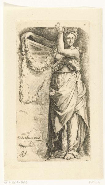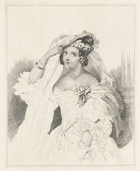 Editor: This is "Portret van een jonge dame genaamd Lilia" – a portrait of a young lady named Lilia. It's a pencil and engraving piece by Henricus Wilhelmus Couwenberg, made in 1838. What immediately strikes me is how the delicate light and shadow work give her an almost ethereal quality. What do you see in this work? Curator: It is a lovely rendering. Notice how the artist uses clothing – the gown, the sheer fabric draped over her head – almost as symbolic armor? Think of the cultural emphasis placed on female virtue in the 19th century. Her clothing is both revealing and concealing, which generates a sort of tension. Editor: Armor…that's an interesting interpretation. I hadn’t considered the symbolic weight of the clothing that way, but the pose is pretty calculated. Do you see any symbolism in her expression or adornments? Curator: Definitely. The slight upward glance of her eyes paired with her soft smile communicates innocence. The carefully arranged flowers pinned at her chest symbolize, of course, burgeoning beauty, love, but also could refer to fragility, especially given the Victorian preoccupation with capturing beauty that inevitably fades. It serves almost as a *memento mori* even within the image. What about you? How do you perceive the flower? Editor: I just thought it was pretty. I suppose everything probably had more deliberate intent back then. Thinking of it as capturing fleeting beauty gives the work a little more depth, though. Thanks! Curator: And you've reminded me how directly art can speak without the crutch of intellectual interpretation. A valuable lesson!