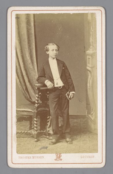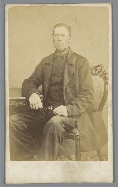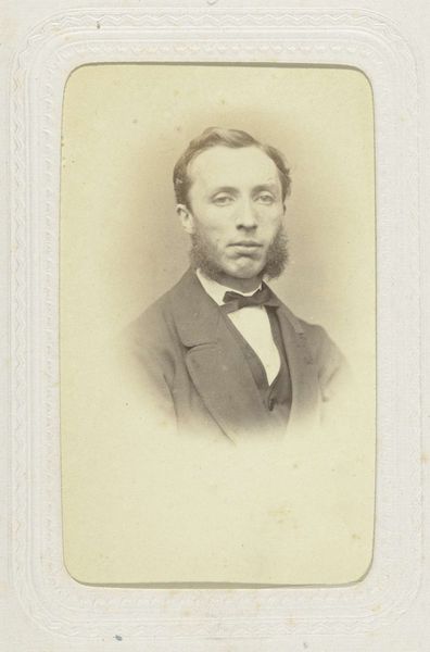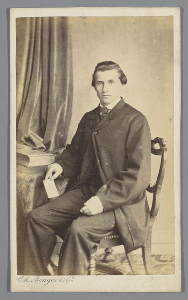 Curator: "Portret van M. Lacombe," or "Portrait of M. Lacombe," captured by Constantin et Cie sometime between 1855 and 1885. It’s a photograph, and though muted, it presents an intriguing glimpse into 19th-century portraiture. Editor: It does seem… constrained. Almost melancholic, though I imagine posing for a photograph at that time wasn't the most comfortable experience. There's such formality, rigidity even, in the composition, but the light gives it a certain softness too. Curator: That controlled presentation speaks volumes. Consider the symbolism – the book, the decorative table. These aren’t merely props. They are coded indicators, projecting an image of intellect, of established society. It’s carefully constructed self-representation for posterity. Editor: Precisely. The subject’s posture, slightly tilted head – it all speaks to power dynamics. Who could afford photography, what power that gave, and what message did they intend sending out. A portrait of the era! We can delve further to consider if M. Lacombe may have engaged in philanthropic pursuits or influenced cultural discourse – revealing possible historical injustices hidden in plain sight. Curator: Ah, and observe his gaze, averted, slightly melancholic as you pointed out, not engaging us directly. Is that deliberate or something of the constraints of photographic technology from the period? To me, there's almost a vulnerability in the averted eyes. Editor: Interesting thought – but consider also the prevailing social expectations for men: self-assuredness, even if feigned, could be achieved by evading a confrontational gaze. This pose possibly emphasizes his self-defined role within that historical moment of cultural development. Curator: Ultimately, this photographic object transcends mere depiction. It represents ambition, societal placement, legacy—tangible through careful compositional clues. The symbolism encoded by Constantin & Cie to reflect the status of Monsieur Lacombe creates continuity with portraits throughout Western painting traditions. Editor: Agreed, these portraits reveal social dynamics within these communities at various scales. Reflecting on that interplay and looking beyond it becomes particularly interesting for our society. Curator: Indeed, bringing together what is timeless while examining through various historical lenses!