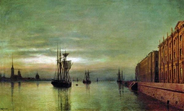Curator: Here we have Ivan Aivazovsky's "The Bay Golden Horn," painted in 1845 using oil paints. Editor: A golden-tinged haze hangs over the scene. The way the light refracts—it's pure Romanticism. A melancholic beauty pervades this cityscape. Curator: Precisely. Notice how Aivazovsky balances the composition with a central vessel silhouetted against the setting sun. It’s all about how light models the scene, the interplay of horizontals and verticals in the ship's rigging, contrasted by the soft domes and minarets along the shore. Editor: The silhouette certainly captures attention. I see the vessel more as a symbol of transit, perhaps of trade routes, or a spiritual journey toward enlightenment as it faces the luminous west. What is this a visual manifestation of cultural exchange between East and West. The light gives a mystical aspect to the quotidian harbour. Curator: Intriguing perspective! My gaze goes straight to the brushwork. Aivazovsky masterfully employs impasto in the foreground waters, giving it dynamism and a tactile quality that juxtaposes against the flat washes of the sky. How is Aivazovsky trying to play with Realism as an approach? Editor: Certainly. It also subtly hints at humanity's relationship to nature's immensity. Each brushstroke echoes emotions, memories. Even that hint of crimson under the building gives it some weight in the memory of viewers. Curator: Do you think Aivazovsky emphasizes form over any profound social statement? The careful calibration of tone, contrast, and textural elements—they serve his formal vision. Editor: I argue against dismissing Romanticism. The emphasis on subjective experience *is* profound! The Golden Horn is not just depicted, but *felt* in its spiritual dimensions. Curator: Well, there's an elegance, however you analyze the artist's style, which lies in the painting’s construction and articulation of light. Editor: True. And in these echoes and the lingering visual language of symbols embedded in its rich textures. Curator: It offers much for eyes trained on pictorial composition, and more.