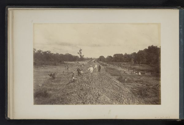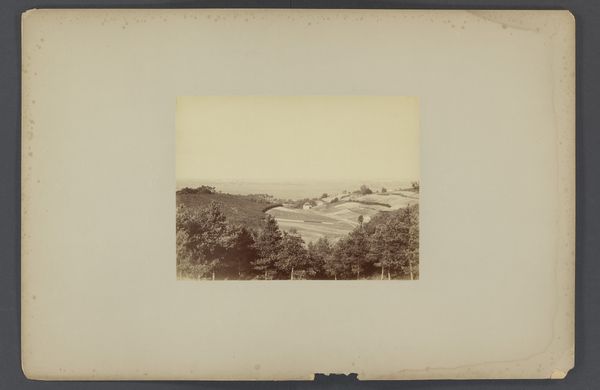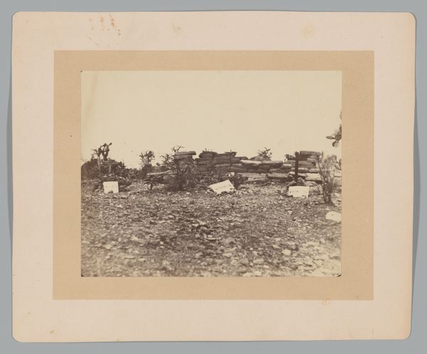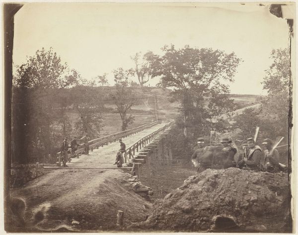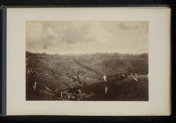 Editor: This is Alexander Gardner's "[Antietam Battlefield]," a gelatin-silver print from 1862. The hazy landscape, the natural tones... it feels both serene and deeply unsettling. What's your perspective on this piece? Curator: The desaturated palette, combined with the almost documentarian landscape style, compels us to look beyond any artistic idealization of war. Consider the labor involved – the photographers meticulously transporting bulky equipment across battlefields. How does the mechanical process of photography here influence your understanding of the "truth" of the image? Editor: That's interesting... I hadn't thought about the physical labor behind creating the image itself. The “truth” would then be shaped by both what’s in front of the lens and how the photographer manipulates that through his process. Curator: Precisely! Gardner’s images weren’t solely objective records. They were consciously crafted, circulated and consumed as commodities that sought to shock viewers and, by extension, mobilize political sentiment. The choice of printing materials too – gelatin silver – adds a layer; a relatively modern, reproducible medium allowing wider dissemination than earlier photographic processes. Where does that commodification sit with you? Editor: I see what you mean. Thinking of it as a commodity changes things. The image then becomes part of a bigger cycle of war, media, and public consumption... it loses that initial serenity and feels heavier somehow. Curator: Indeed. By examining the means of production, we gain insight into how the artwork itself actively participates in, and comments on, the social and material conditions of its time. It invites us to contemplate the complex relationships between art, labor, and consumption. Editor: I never really thought about the economic and material conditions behind photography before. This has given me so much to consider! Curator: Wonderful! Analyzing the material production brings the realities behind an image, particularly one portraying war, into sharper focus.