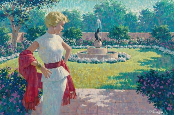 Editor: This is “Garden Steps” by Arthur Sarnoff, a painting rendered in what seems to be a plein-air style. I’m immediately struck by the composition—the way the staircase cuts diagonally across the canvas. How would you interpret the formal aspects of this painting? Curator: Certainly. Consider the rigorous geometry at play here. The staircase, with its receding steps, establishes a strong sense of linear perspective. Note how Sarnoff employs a limited palette of predominantly pastel hues to create visual harmony and unity within the picture plane. Are you also noticing the carefully constructed light? Editor: Yes, the light seems quite soft, almost diffused, creating a tranquil, serene atmosphere. And I’m also thinking about how the repetition of vertical elements - the trees and balusters - creates a structured rhythm within the landscape. Curator: Precisely! The structural organization, balanced with naturalistic elements such as foliage, results in a study in pictorial equilibrium. Do you see how the figure, dressed in white, serves as a focal point? She anchors the composition, preventing the eye from escaping the constructed space. Editor: That’s a great observation. So, the figure becomes part of the formal structure, rather than simply being a subject *in* the landscape. It makes me think about the function of genre paintings and portraiture. It is very impressive. Curator: Exactly. The formal structure elevates the ordinary, transforming a mere scene into a meticulously designed composition. Editor: Thank you, I hadn’t considered the interplay between naturalistic representation and geometrical forms this way before! Curator: A deeper formal examination often reveals those subtle but significant connections between form and content.