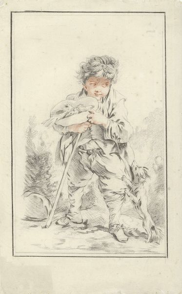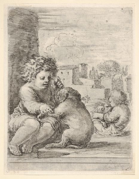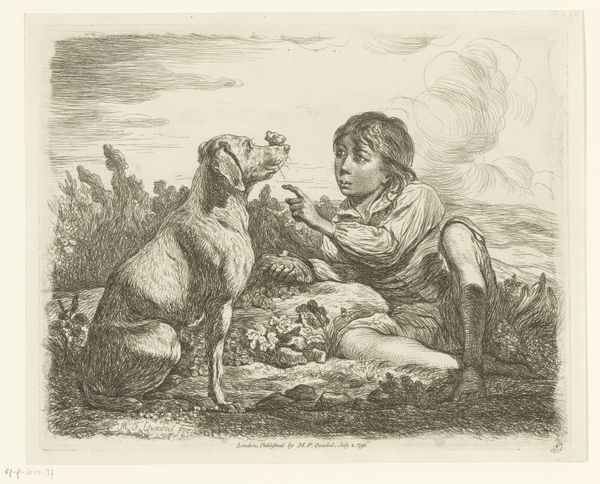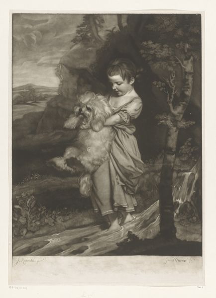 Francesco Bartolozzi created this print, "Portret van Philip Yorke met hond en vogel," employing delicate lines and tonal contrasts to capture a scene of youthful innocence. The composition is softly lit, emphasizing a smooth texture and a gentle mood. The visual structure creates a hierarchy through scale and placement; young Philip is central, drawing our eye through an arrangement that includes the adoring dog and a delicate bird. Bartolozzi's strategic use of line and form transcends mere representation; it speaks to the era's values, where childhood was increasingly viewed through a sentimental lens. Consider the interplay of gazes—the boy at the bird, the dog at the boy. These visual connections invite us to contemplate relationships and the structures of attention itself. This print is not just a record of a child, but a thoughtful exploration of visual and social dynamics rendered through a carefully constructed formal arrangement.
