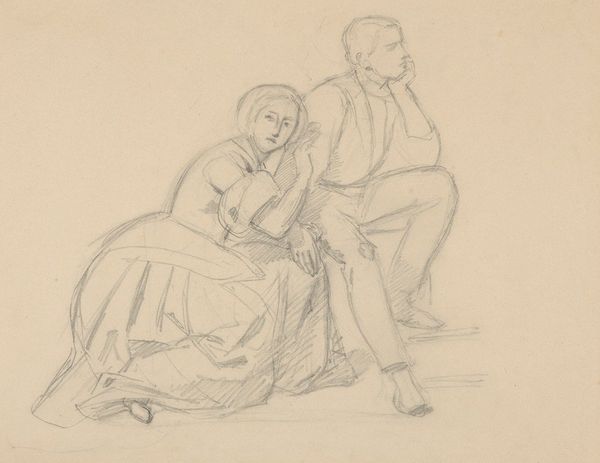 Wilhelm Marstrand made this drawing, “En pige trækker en mand i øret”, or “A girl pulling a man by the ear” using graphite on paper. The rough, unfinished quality of the graphite gives the drawing a sense of immediacy, as if capturing a fleeting moment. See how the artist uses quick, gestural lines to define the figures and their movement, focusing on their interaction rather than precise detail. The texture of the paper itself adds depth, with the graphite catching on the surface to create areas of light and shadow. Consider how the simplicity of the materials emphasizes the narrative. The artist's choice to work with graphite, a common and accessible medium, removes any pretension and brings attention to the dynamics between the figures, highlighting the social commentary with a raw, unfiltered quality. Ultimately, the artwork reveals the power of modest materials to convey complex relationships and social observations, blurring the lines between fine art and everyday expression.