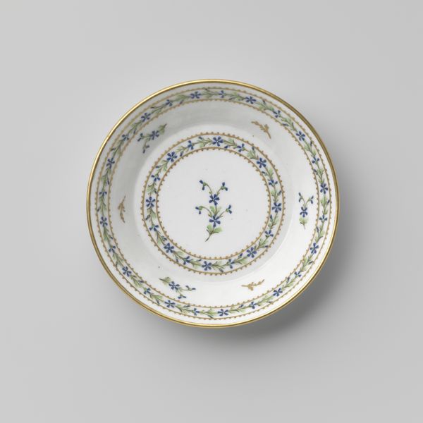 Curator: Looking at this Minton's Tazza, created between 1843 and 1853, now housed at The Met, I immediately think about the symbolism. What's your take? Editor: First impressions? Serenity. It’s this quiet object that just radiates a poised elegance. The scale seems perfect, not ostentatious but…gracefully present. Curator: Yes, precisely! The understated decorative band evokes historical emblems, almost heraldic but simplified. The white space allows the few painted emblems to carry so much weight. Editor: Mmm, heraldic, maybe, but defused. The colors - that cobalt blue and the burnt umber- feel significant, as if speaking through codes we've collectively almost forgotten. Like visual echoes. What's this symmetry trying to tell us? Curator: I think it gestures towards aspiration and order. Notice how the symbols and colors connect through history, hinting towards cultural continuity and memory. They may offer an indirect look into the aesthetics valued at the time. Editor: And there is something almost too-perfect, which for me is really captivating. It's like an idealized representation of domestic harmony. Curator: I can see that, yes, it's tempting to consider the cultural messages ingrained within domestic pieces such as this tazza. Its form reminds us how beauty becomes enmeshed with purpose, elevating common environments and reminding us of history. Editor: Absolutely. Art that elevates ordinary moments and infuses them with significance is art that truly speaks across time. To see how such meticulous intention was poured into an item so effortlessly beautiful... It encourages one to see deeper value in art.