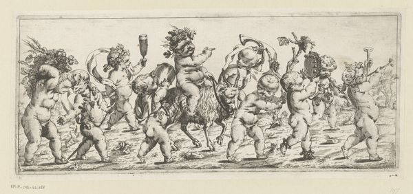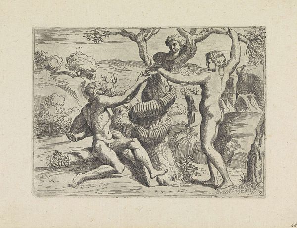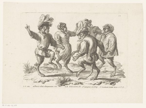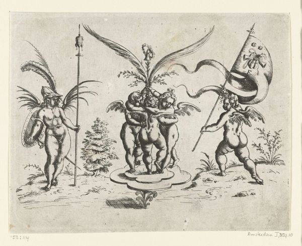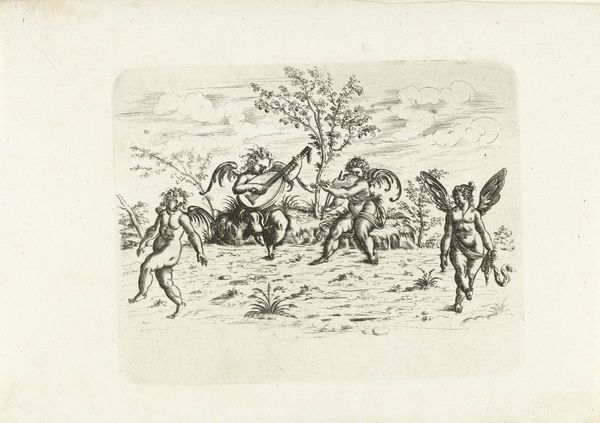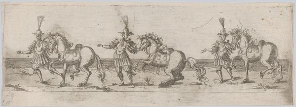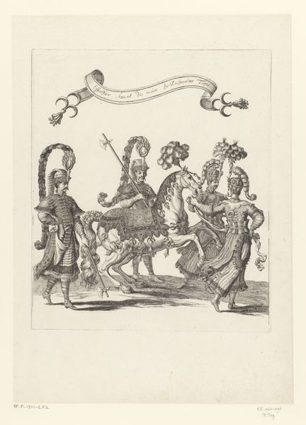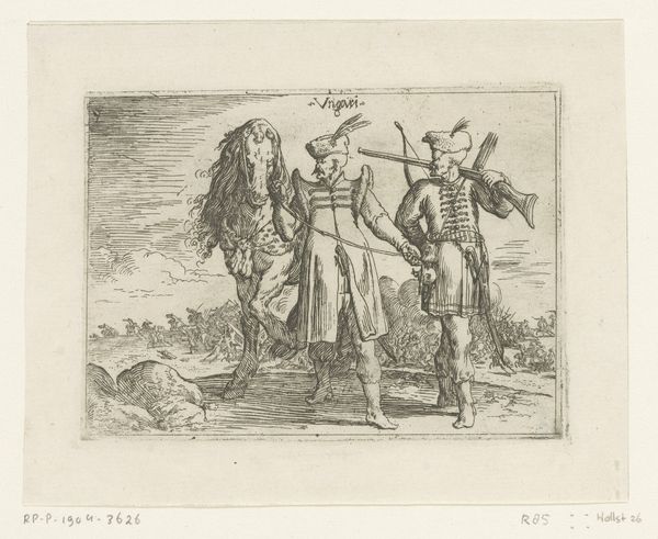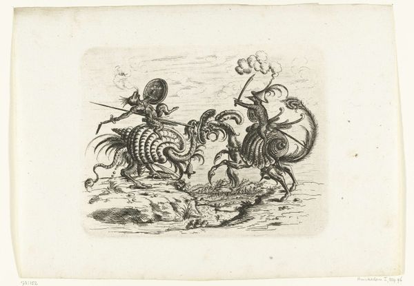 Christoph Jamnitzer created this print, *Landschap met een koe tussen twee fantastische wezens te paard,* at the turn of the 17th century. As the Holy Roman Empire was fragmenting, artists turned to mannerism, a style known for its exaggeration and distortion. Here, Jamnitzer extends and distorts the familiar themes of the hunt, recasting them into the realm of fantasy. Two figures on horseback, adorned with elaborate, almost theatrical ornamentation, flank a cow. One figure raises a rifle, smoke billowing from its barrel. The other holds a serpentine spear, its form echoing the twisting foliage of the background trees. This print speaks to the intersection of power, spectacle, and the natural world. The hunters’ elaborate costumes and weaponry underscore their elevated status and their dominion over the animals they pursue. It's a vision that reflects the social hierarchies of the time. But perhaps there's a more playful commentary here as well, as the exaggerated ornamentation borders on the absurd. The emotional resonance of this piece lies in the tension between the familiar and the fantastical, inviting us to reflect on the boundaries between reality and imagination, power and parody.