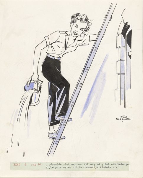 Hans Borrebach made this drawing, Lien loopt door een storm, with ink and watercolour. It's all about the process here, isn't it? You can see the artist thinking through the lines and colours. The washes of pale blue are thin, almost transparent, sitting against the decisive black lines that define the figure. Look at the way he’s used the horizontal lines to suggest the force of the wind. There's something so gestural about that hand on her head, like she’s pushing against the storm, yet she's got a smile on her face. I love the imperfection of it, how the colours bleed into each other, revealing the hand of the artist. The blue of her coat against the black and white scarf creates a striking contrast. It reminds me a little of Matisse's line drawings, that same sense of capturing a fleeting moment with minimal means. But Borrebach brings his own energy, a lightness and humour that makes the image feel both immediate and timeless. What do you see?