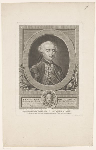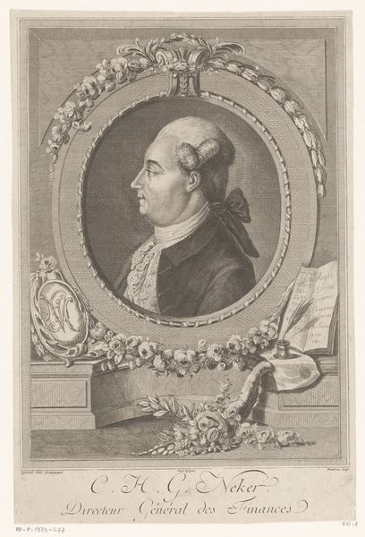 Curator: Here we have Georg Friedrich Schmidt’s 1762 engraving, "Portret van Ivan Shuvalov." Editor: The precision is astounding. It feels quite formal, even a bit austere. All those tiny lines create an almost photographic level of detail within the oval frame. How do you interpret this work through its form? Curator: Let's consider first the line quality. Note the delicate yet precise hatching that defines the sitter’s features and clothing, which presents a contrast between smooth and coarse surfaces. It's fascinating how Schmidt uses varying densities of line to sculpt form and create tonal values. Also, look closely at the placement of the text in relation to the portrait— how does the swirling text affect the viewer's reading of the work, and does it influence the meaning we extract? Editor: That's interesting. I hadn't really considered the connection between the portrait and the script around it. It’s clear now that the script is also an integral part of the artistic composition! Why include such an inscription around the central figure? Curator: It invites closer scrutiny and reveals another layer to the artwork; we must look beyond a mere portrait, beyond likeness. The semiotic relationships invite engagement beyond the pictorial representation. The lettering and frame serve an aesthetic, and not just communicative function. They work in harmony, and provide emphasis through counterpoint. Editor: I never thought about how much form alone can reveal! Thank you for focusing my attention on such intricate yet subtle attributes, and demonstrating their expressive capacity. Curator: It underscores the communicative potential embedded within the material itself. I learned from you too -- from your focus on initial impression to finer structural consideration, it all works as a feedback loop in learning about an artwork.