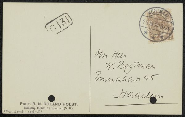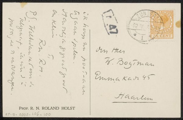 This is a postcard by Richard Nicolaüs Roland Holst to Willem Bogtman, probably made with pen and ink. The script is so open, flowing and quick, and like all the best handwriting, you can feel the speed of the writer’s hand, and the rhythm of thought becoming language on the page. It’s a humble piece of paper, marked with ink, the postmark, and a small stamp, and this creates an intimate emotional experience. Holst makes no attempt to conceal or obscure the process – every stroke is laid bare. I love the way the individual marks form themselves into words, which then become a message of sorts. The diagonal slash of the pen, like a fast, personal brushstroke, almost bisects the card, creating a formal and metaphorical division. It makes me think of Cy Twombly, who also reveled in the direct, unfiltered mark. For me, this piece highlights how art is an ongoing conversation across time, always open to new interpretations.