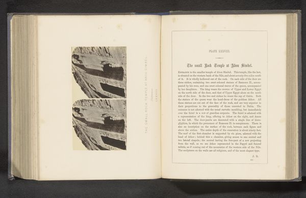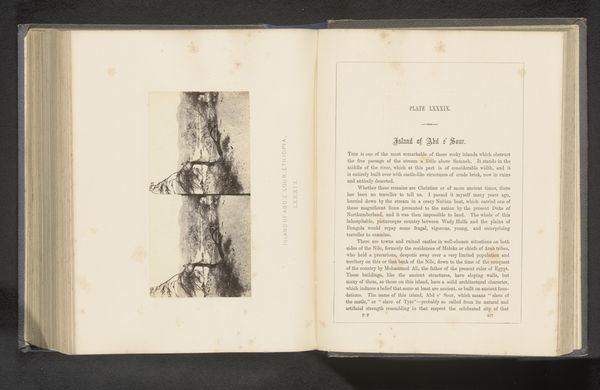 Curator: We're looking at "Gezicht op Sinaï," or "View of Sinai," a print created before 1862 by Day & Co. It's presented within the pages of an open book, displaying a stark yet serene landscape. Editor: My initial impression is one of coolness. The grayscale tones and vertical composition create a sense of height and quietude, as though we are observing a dreamlike realm. It looks rather forbidding. Curator: Indeed. The visual weight of mountains in the engraving resonates deeply. For centuries, Mount Sinai has signified revelation and law, fundamental to Judeo-Christian and Islamic traditions. Its imposing image calls upon this historical significance. Editor: And the engraving technique really accentuates that imposing verticality. Look at how the lines build up, almost as if the mountains themselves are being built stroke by stroke. This isn't about capturing a likeness, it's about creating structure. Semiotically, we're seeing verticality linked to elevation of another sort. Curator: Precisely. The act of creating a view within a book connects it with knowledge and journeys, inviting reflection. Pilgrims, travelers, seekers – this image offers itself to them. The mountains also embody permanence and spiritual challenges that must be faced to be overcome. Editor: I’m noticing the aged paper. It seems the creators of this plate carefully consider how a page shows its passing. How appropriate for a landscape so heavily layered with tradition, history, and symbolism! Curator: It underscores how cultural memories persist over time through such imagery. This view on paper invites contemplation about faith and the endurance of sacred geography. Editor: Looking closely, I appreciate the strategic balance of the heavy textures and bare paper—an interplay of forms which helps create the overall emotional tenor of the engraving. The texture makes one feel the stone and perceive the volume. Curator: Yes, it is interesting how that juxtaposition makes such an impact. I leave contemplating this further with greater knowledge. Editor: Me too, now to delve further in.