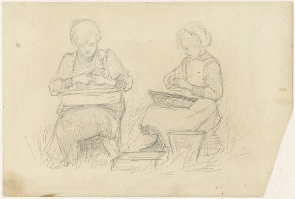 Editor: Here we have Jozef Israëls’ “Three Seated Children in the Grass,” likely dating from sometime between 1834 and 1911. It’s a delicate pencil drawing. The sketch-like quality makes it seem so intimate, like a candid glimpse into childhood. What do you see in this piece beyond its surface charm? Curator: Beyond the immediate sweetness, I see a work deeply rooted in its socio-cultural context. Israëls came from a background marked by social concern. So, in light of that, how might this simple scene reflect broader societal attitudes towards children during that era? Editor: I guess I hadn’t considered that it might be more than just a portrait. You’re suggesting the image might be engaging in the politics of childhood representation at that time? Curator: Exactly. During the late 19th century, childhood was becoming an increasingly politicized subject. Artists started portraying children less as miniature adults, more as vulnerable beings deserving protection and nurturing. Notice Israëls’ rendering—delicate, yes, but also with a certain weight of contemplation, even melancholy, in their postures. Does that change your interpretation? Editor: It does. I see a sense of vulnerability I missed before. But I’m wondering, is it possible we’re reading too much into a simple drawing? Maybe he was just sketching what he saw? Curator: It's a valid question. However, artists are always products of their time. Even a seemingly simple sketch can reveal societal values. Think about how Israëls' works were displayed – within the walls of bourgeois homes, contributing to constructing an image of family and innocence during times of massive industrialization and societal change. These weren’t simply objective snapshots. Editor: So, it's not just about what's in the drawing, but how it circulated and what cultural work it performed? Curator: Precisely. Israëls' sketchbook becomes a social document. Editor: I see, I was focused on the artist’s intention, but the social life of the artwork matters just as much. Thanks!
