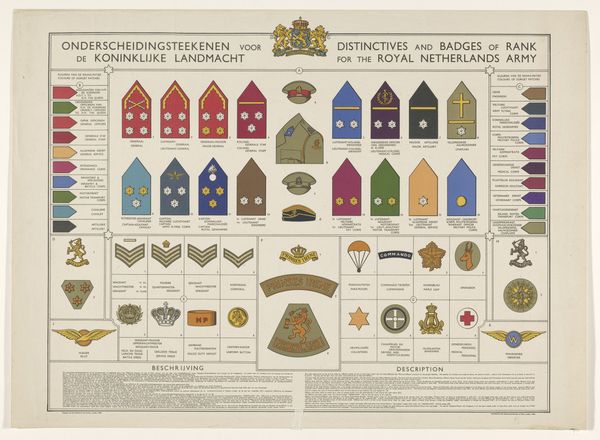 Curator: Right, let's dive into this intriguing "Vlaggenkaart," or "Flags Chart," dating back to 1901 and attributed to J.H. de Bussy. It is an early example of print. Editor: My first impression is...order! It's like a little organized riot of colors and symbols. There's something inherently pleasing about grids. Though it seems almost encyclopedic. A decorative artifact meets knowledge catalog. Curator: Indeed. The organizational principle at play here is quite remarkable. You'll see it’s neatly divided into sections. First, we have 'Royal Standards and Flags', then 'Dutch Standards, Command, and Distinction Flags', and finally, 'Flags of Various Nations'. Look closely, and you observe, the printing is immaculate. Editor: I'm interested in the material effect; there's this curious, subdued palette--mostly muted reds, blues, and creams. These seem like a deliberate choice. So proper. It lends an old-world almost quaint gravity. It's like gazing into a time capsule of national aspirations rendered in miniature. It also reveals something of that specific graphic printing from the period. What do the geometric forms say? Curator: Good question. Formally, these geometric forms are statements of power and identity. Each flag, in its unique combination of shapes and colors, represents a nation's attempt to visually define itself, literally brand itself. In that time period, those emblems represent that sense of belonging that the designer and printer must have been completely cognizant of. But of course, to many nowadays the symbols now feel foreign, if at all even offensive, the exercise of identifying through national pride and global tension may come across very differently. Editor: Yes. There's this slightly melancholic air of bygone empires. It triggers introspection about the very notion of fixed identity--nationally, culturally...aren’t we just a flowing mix of narratives, histories and longings. Curator: That’s beautiful. So to summarize, perhaps beyond being merely a flag chart, this piece stands as a thoughtful visual exercise of a time of empires, identity, geometric abstraction, and quiet commentary about representation. Editor: A complex flag, signaling layers of history in elegant little packages. I quite agree!