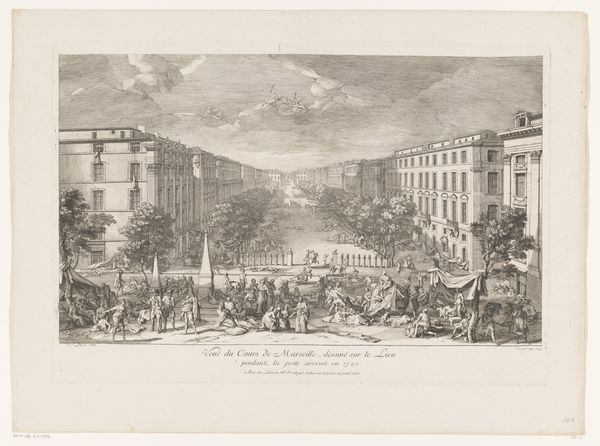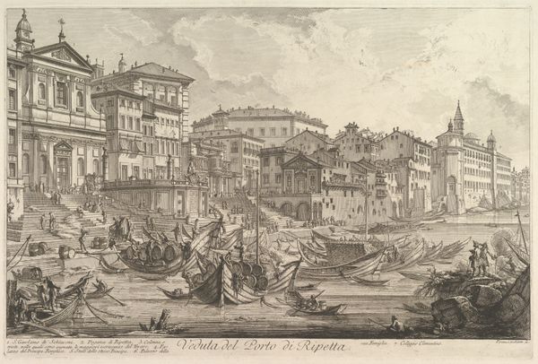 Editor: So, this is "The Piazza di Spagna," an etching by Giovanni Battista Piranesi, dating from about 1745-1755. The detail is incredible! All those tiny figures... it really captures the hustle and bustle. How do you see the materiality contributing to its meaning? Curator: For me, this piece screams process. Piranesi, through the meticulous labor of etching, isn't just depicting the Piazza di Spagna; he’s participating in the spectacle of Rome, the commerce of art-making. Consider the accessibility of prints - how this materially democratic format circulates idealized visions of power. Editor: Democratic, but still presenting an idealized vision? Curator: Exactly. Note the flawless perspective, the theatrical staging of everyday life. The consumption of this image fuels the grand narrative of Rome as a site of both power and beauty, a place of aspiration but also an entity built with materials extracted by countless workers whose realities were vastly different from the consumers of this image. The act of acquiring this print – a material object itself – ties into a larger network of consumption and cultural capital. Does that shift how you see it at all? Editor: I see what you mean. It’s not just a picture; it’s a commodity. I was focusing on the artistry, but you’re highlighting the socio-economic framework of its production and consumption. So the print’s widespread availability is almost a distraction from the less democratic realities outside the frame. Curator: Precisely. And look closer at the different kinds of labor presented in the foreground–are some more privileged or ennobled? This material act, the print itself, carries embedded values. Editor: Wow, that gives me a lot to think about in terms of accessibility and the labor conditions for similar artworks in this time period. Thanks! Curator: It was a pleasure; I’m glad I could help shed some light!