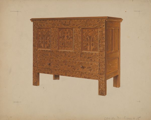 Curator: What strikes me most is its static formality, its rigid symmetry. The brown of the wood seems to suffocate any sense of dynamism, any potential narrative. Editor: We are now observing “Chest of Drawers,” circa 1938, by Arthur Johnson. It appears to be rendered with watercolor and perhaps a little drawing, capturing a piece that blends realism with decorative art sensibilities. The question this raises for me is about access. Whose space would this chest adorn, and what statements does its display communicate within a home during that time? Curator: Note how the artist prioritizes texture through the swirls and the decorative molding along the sides and at the feet, yet these surface details still read as somewhat flat due to the subdued tonal range. This contributes, paradoxically, to both its realism and decorative quality, doesn’t it? Editor: Absolutely. In terms of period context, Johnson created this during an era grappling with the Great Depression. Practicality and visual appeal walked a fine line in many households. Is this a document of aspirational living or perhaps a glimpse into a style that resonated across socioeconomic divides? Curator: I see its decorative impulse through an aesthetic lens. Observe the contrast between the curved facade of the drawers and those almost severe, spiraled columnar supports. This play establishes tension, creating dynamism within stillness and preventing the artwork from being totally static. Editor: You know, situating the piece historically, it is impossible to ignore questions of gender and domestic roles of the era. Was this chest viewed through a particularly gendered lens, defining private space for one member of a household over others, for example? How was such furniture contextualized in art publications during its time? Curator: The piece could stand for a subtle rebellion through a blending of classical and modern. We might read its simplicity of form against the extravagance of the flourishes as a quiet commentary on pre-existing structure. The brass knobs and keyholes dot the artwork, providing it with structure through these punctuations. Editor: Fascinating how something that presents initially as straightforward representation of a functional piece becomes, upon scrutiny, such a complex encapsulation of the domestic history it served. Thanks for taking us on a structural voyage into the meaning embedded within its grain. Curator: Indeed. Looking closely, these functional considerations unlock even deeper resonances.