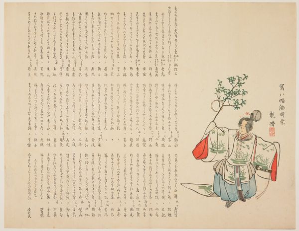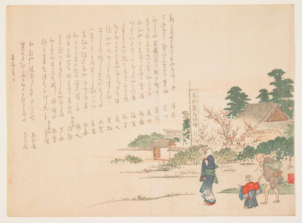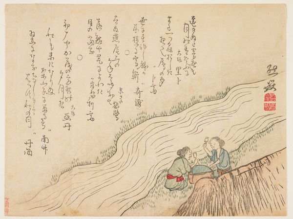 Curator: Ueda Kōkei’s woodblock print, "Outing in the Autumn Field," created sometime between 1830 and 1844, captures a serene moment, doesn’t it? What strikes you about it? Editor: It’s breezy! Those long grasses, the subtle palette—it's all so wistful and evocative. There’s an interesting contrast too, with the rigid vertical lines in the upper right, almost like a fragmented screen, and the organic flow of the figures. Curator: Absolutely. The composition masterfully plays with tradition. You've got that quintessential Ukiyo-e focus on everyday life – here, these two figures out for a stroll, rendered in a style readily accessible to the merchant class. However, the prominent calligraphy pushes us to see the image less as a "snapshot" and more like a dialogue with the poetry it features. It encourages viewers to connect themes of nature, transience, and relationships. Editor: You’re right, it isn't a simple snapshot! It makes me wonder what the poem says, whether it’s related to their conversation...or to what they are seeing on this 'outing’. I also see an interesting juxtaposition between text and figures—sort of two parallel narratives happening. And it reminds me of vintage postcards, capturing transient, melancholic feelings. Curator: Precisely, the ephemerality of moments and emotions! It touches upon very similar ideas prevalent in feminist discourse—lived experiences, identity formation, but through the particular lens of Edo-period Japan. Think about how societal expectations shaped leisure, travel, even clothing choices for women during that time. What might appear a charming countryside scene invites an examination of gender roles within a stratified social hierarchy. Editor: True! There is definitely an emotional depth to what is going on between the figures, too, almost a coded world to the woman and the society that she inhabits. Curator: And through that seemingly small snapshot of this world, these works open vast conversations with what that was, and how it still reverberates now. Editor: Exactly, those brief glimpses, small moments captured… it almost makes the 'outing' we are now doing feel special and very present!