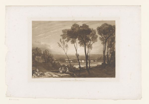 Editor: This is "Bridge in Middle Distance" by Charles Turner. The sepia tones create a nostalgic feel. What strikes you most about its formal qualities? Curator: The delicate tonal gradations create depth and atmosphere, yet there is an underlying structure that gives the image its strength. Consider the interplay of light and shadow, the way the eye is led to the bridge and beyond. Editor: It’s interesting how the figures in the foreground add to the composition. Curator: Indeed. Their placement is deliberate, creating a sense of scale and guiding the viewer's eye. Notice how the forms echo the curves of the bridge, enhancing the overall harmony. The texture of the foliage too. The artist has balanced the composition. Editor: I see that now. I appreciate learning to observe these subtleties. Curator: Formal analysis reveals so much about an artist's intent and skill.