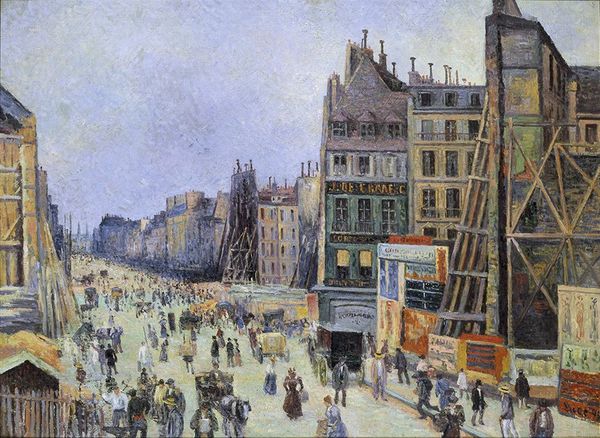 Editor: This is Camille Pissarro’s “The Place du Havre, Paris” from 1893, rendered with oil paint. It depicts a bustling city scene, yet there's a remarkable serenity to it. The palette is soft, almost dreamlike. What cultural symbolism can we unravel from such a commonplace scene? Curator: Indeed, a "commonplace" scene holds layers. Consider the flâneur, the stroller, almost a symbolic figure in late 19th-century Paris, witnessing and being absorbed by this emergent modernity. What does the painting seem to recall to you, perhaps unconsciously? Editor: I see progress, but also tradition clinging on with the horse-drawn carriages. There's this push-and-pull effect. It's like Paris is trying to figure out what it's going to become. Curator: Precisely! Note how the buildings themselves—these stoic structures—bear witness. Each window could represent a story, a life lived within this rapidly transforming world. What emotional connection does that symbolism ignite? Editor: A sense of being watched, almost. That the past is always looking at us, judging. The present is fleeting. Curator: An excellent observation! Pissarro uses the "fleeting" moment of Impressionism to ask what endures, what remains valuable, amid relentless change. The individual disappears into a crowd, the crowd moves toward modernity, yet...are they truly together, truly sharing a common goal? What remains "sacred" within that progress? Editor: So, even a snapshot of daily life becomes a canvas for broader questions about identity and culture. Curator: Absolutely! Every brushstroke carries intention. Understanding such pieces provides not only insight into past, but allows a visual language for navigating our contemporary condition, its accelerating complexities. Editor: It’s amazing how much is packed into this "simple" painting. I will consider this painting differently from now on.