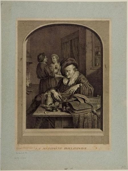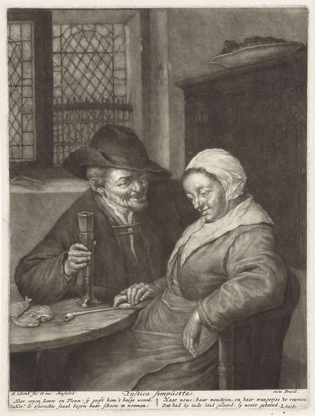 Curator: This is "Man and Woman Drinking," an engraving by John Smith, who lived from 1641 to 1690. It's currently held in the Harvard Art Museums. Editor: There's a palpable tension in the composition. The way the man's hand rests on the woman's shoulder, the shadows... it feels unsettling. Curator: It reflects a societal unease. Taverns were often spaces of social mixing, sometimes viewed with suspicion, particularly concerning gender roles and public behavior. Editor: The artist's use of light and shadow, particularly around the faces, really emphasizes the emotional weight of the scene. The woman's upward gaze is particularly striking. Curator: Indeed. Smith uses the conventions of genre scenes to explore the complex social dynamics of the time. These images served as moral commentary for the rising middle class. Editor: It is fascinating how an artist can use light, line and form to create a window into another era. Curator: Right. It's not just a picture of drinking; it's a lens through which we can view the anxieties of early modern society.