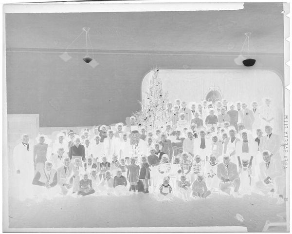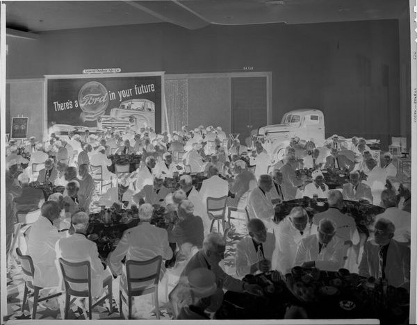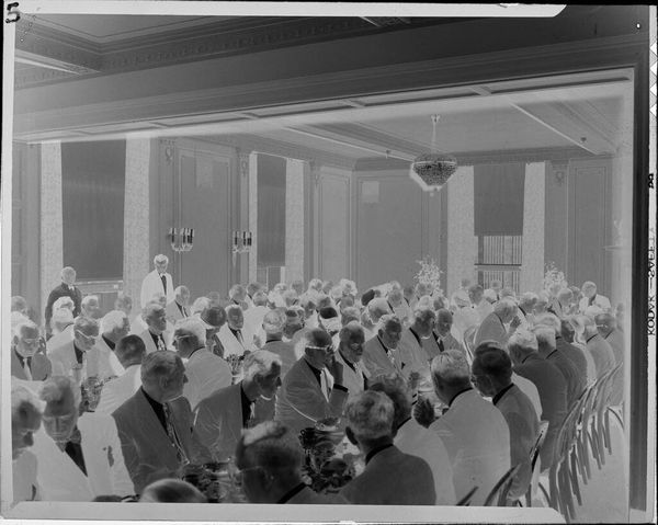 This photograph of a large group of women at banquet tables was taken by Robert Burian. It’s a small, black and white print, and it feels like it was made in a flash – as if it was important to catch a particular moment. The tonal range is narrow, leaning towards bright whites and darker shadows, which gives it this stark, almost high-contrast feel. The negative’s grainy texture adds a layer of depth. Look at the heads, all in a row, and the table settings: the longer you look, the more they start to break down into abstract marks. The flatness of the photograph makes you want to reach in and mess with it, you know? It reminds me a little of Thomas Demand, who also plays with photography’s ability to capture and distort memory. But where Demand meticulously recreates scenes, this image feels more immediate, more like a snapshot of a particular social gathering. What kind of world do you think they’re building together?