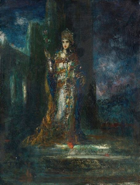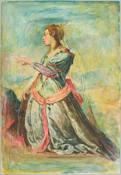 Editor: This is William Hatherell's "O, Romeo, Romeo, Wherefore Art Thou Romeo?" from the Tate Collections. The soft colors give it such a dreamy quality. What do you see in this piece? Curator: Note how Hatherell uses vertical lines – the column, the implied lines of Juliet's pose – to create a sense of upward movement. This visual strategy emphasizes her longing and anticipation. The composition guides the viewer's eye. Editor: That's a fascinating way to look at it. I was focusing on the emotions. Curator: Emotions are present, but the formal elements articulate those sentiments within the framework of the visual. Do you notice how the buildings in the background contrast with the softness? Editor: Yes, now I do. Thanks for pointing that out! Curator: Indeed. The construction and arrangement of forms dictate the viewer's experience, influencing the narrative and shaping its reception.