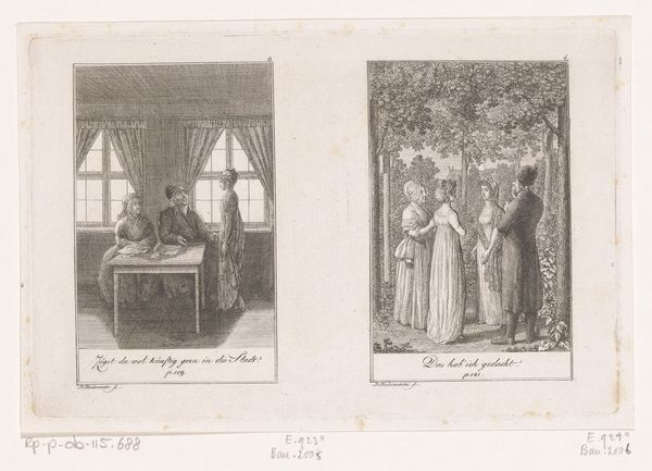 Daniel Nikolaus Chodowiecki created these two images from Wilhelm Gottlieb Becker’s stories, using etching as his medium. Chodowiecki lived through the Enlightenment, a period marked by the rise of reason and individualism. Here, the characters move through social spaces that dictate their interactions. Note the women’s elaborate dresses and the men’s formal attire, indicative of the social status and norms of the time. The images hint at narratives where social expectations and gender roles are prominent. What do these interactions tell us about how men and women were expected to behave? Chodowiecki’s work captures moments of social life, inviting us to consider the power dynamics and cultural norms that shaped people’s lives then, and continue to influence us today. They encourage reflection on how individuals navigate societal expectations and express their identities within set boundaries.