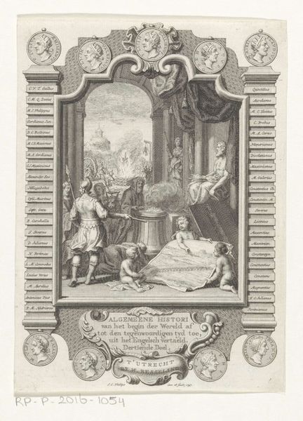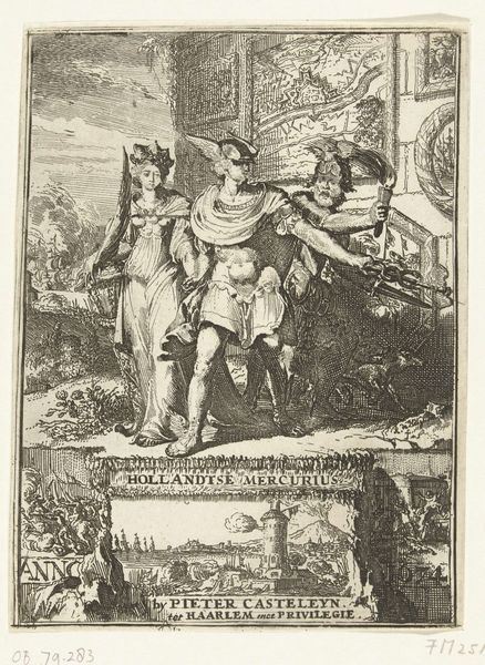 Editor: This print, "View of Utrecht and Allegory with Minerva and Virtues," is attributed to Noach van der Meer the Elder, created sometime between 1728 and 1771. It’s an etching, with pen and engraving—a combination of cityscape and symbolic figures. I'm struck by how the detailed rendering of Utrecht seems to contrast with the more theatrical allegory below. What do you see in this piece? Curator: I see a deliberate commentary on power and knowledge, carefully constructed within its historical context. The cityscape provides a literal grounding, while the allegory invites us to interpret Utrecht's identity. Minerva, the Roman goddess of wisdom and strategic warfare, takes center stage, and her presence suggests the city’s aspiration towards intellectual and martial strength. How do you think the surrounding virtues contribute to that aspiration? Editor: I guess they embody different aspects of a virtuous and powerful city—justice, prosperity, artistic excellence. But why combine them in a single image? It seems like a rather grandiose claim. Curator: Exactly! The artist constructs an idealized version of Utrecht, projecting civic pride and ambition. Considering the time period, think about the political and economic struggles, and how the print’s symbolism served as a form of cultural propaganda. What social functions might art serve? The composition blends realism with idealization, shaping a specific narrative. What’s more: whose narrative is being constructed? And whose narratives might be actively suppressed? Editor: So it's not just a depiction of Utrecht but an argument about what Utrecht *should* be, presented through a very specific lens. It almost makes the cityscape seem like a backdrop to this ideal. Curator: Precisely. And who are the intended viewers? Likely affluent citizens, members of the elite classes who had the power to act on—or reject—this vision. The work prompts us to reflect on who benefits from these idealized images, and at whose expense. Editor: It really changes how I see it now. I was initially drawn to the detailed landscape, but the allegory becomes the central point of an argument about civic identity. Curator: Indeed. It underscores the necessity of interrogating any representation, identifying its claims, and understanding whose interests it ultimately serves.