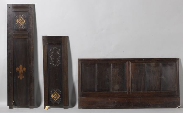 Curator: I'm struck by the imposing nature of these panels. They command a certain reverence with their height and meticulous carvings. Editor: Indeed. We're looking at 'Deel lambrizering, afkomstig uit het huis van Dentz van Schaick', dating back to circa 1900-1905, now housed here at the Rijksmuseum. They were crafted by Carel Adolph Lion Cachet, a name synonymous with Dutch Arts and Crafts. The panels feature intricate wood carvings in relief. Curator: The wood itself presents a dichotomy—the light framing wood provides a vivid border around the darkly stained carved panels, almost a literal framing of art itself, and the symmetry really heightens a sense of formalized aesthetic intention. The details seem painstakingly rendered; I see repeated geometric motifs and stylized floral elements, but are there suggestions of specific meanings beyond just decoration? Editor: Cachet was deeply influenced by the Arts and Crafts movement, a reaction against industrialization. The movement emphasized handcraftsmanship and the integration of art into everyday life. These panels would have originally been part of the wall panelling, a decorative interior feature that reflected a wealthy patron’s taste and social standing, so the carved details speak to the socio-economic contexts and a renewed appreciation for skilled artisanship, reflecting ideals of beauty. Curator: Do you see in the designs any reflections of the architectural trends and aesthetic philosophies that would have been present at the time of the construction of the home? Editor: The stylistic and patterned carvings definitely reflect a desire for visual complexity; there seems a deliberate integration with architectural trends and styles, particularly the aesthetic values that were being established by Dutch elites at that time. These are not simply decorative additions but intentional displays of social identity, revealing specific details about how people desired to express themselves within these walls. Curator: A fitting addition to the museum, showcasing the layered dialogues that emerge when the aesthetic meets the historical. Editor: Absolutely, viewing it in terms of texture, materiality, and composition allows us to trace the aesthetic intent while revealing compelling clues about this cultural moment.