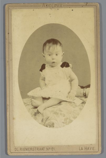 Curator: Here we have an albumen print titled "Portret van een onbekend kind in stoel," dating roughly between 1886 and 1913. The photographer, Adolphe Zimmermans, captured this portrait for his studio in La Haye, Netherlands. Editor: The first thing that strikes me is how deliberately posed the child is, and yet, the effect is strangely disarming. There's an inherent vulnerability despite the formal setting, like a puppet placed on a stage. Curator: That's a keen observation. These studio portraits of children often reflect the parents' aspirations, projecting respectability. Consider the child's placement within a luxurious armchair that doesn’t seem fitting to its scale. But such respectability could sometimes conflict with the reality of lived experience, given that child mortality rates remained shockingly high in the era. Editor: Right, that chair becomes symbolic – an oversized throne, almost, but the child's bare feet bring everything down to earth. There’s this interplay between innocence and manufactured presentation, between a staged symbol of social aspiration and the raw physicality of an infant. The gaze meets us directly but the child is really seeing...what? Curator: What indeed. The image certainly draws out societal tensions between performance and authentic selfhood. It presents us with an innocent child who perhaps is also burdened by expectations it doesn't fully comprehend, yet cannot escape, either. Editor: I’m wondering about Zimmermans’ artistic intentions, too. There is something of the Pre-Raphaelites or Aestheticism in this image—not in its technique but in its ethos. A fascination with artifice, or capturing something eternal within something temporal...that is perhaps beyond a portrait. It evokes an odd mixture of melancholy and naive expectation of some undefined future. Curator: Ultimately, this portrait opens up dialogues about identity, the representation of childhood, and the performance of class in the late 19th century. The material elements, from the albumen print to the ornate armchair, tell their own story about societal anxieties and aspirations. Editor: And how, even in capturing a single child, Zimmermans inadvertently constructed a tableau of timeless visual paradoxes which linger for us even now.