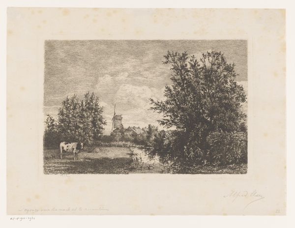Alfred Elsen made this landscape with four willows and a stream using etching, a printmaking technique, sometime around the late 19th century. The stark contrast of dark lines on light paper defines the image. To create this effect, Elsen would have covered a metal plate with a waxy, acid-resistant ground, then scratched an image into it with a needle. Immersing the plate in acid would bite away the exposed lines, creating grooves. Ink is then applied to the plate, wiped clean, and the image transferred to paper under high pressure. The network of fine lines used to create this landscape speaks to the labor involved in the etching process. The precision required shows us a deliberate and meticulous approach to capturing the scene, an aesthetic choice that elevates the print from mere reproduction to a work of art in its own right. The processes of making gives this image its impact, blurring the lines between fine art and craft.
