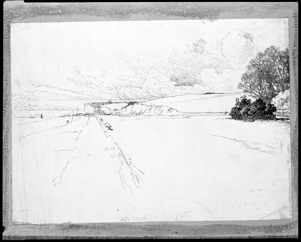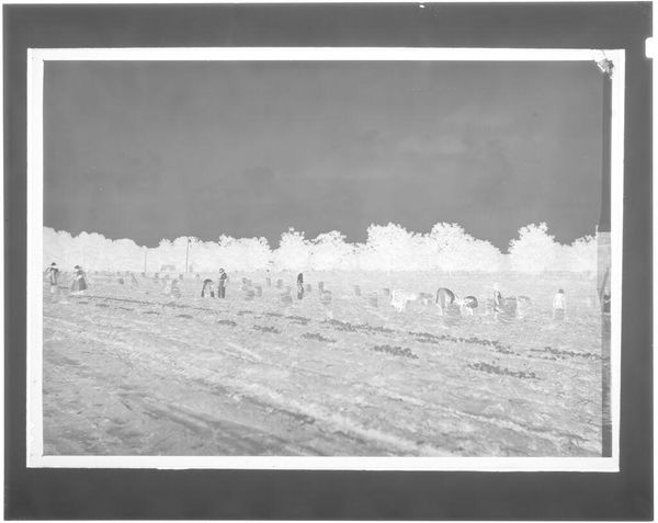Curator: This is an untitled image, sometimes called "game on field," by Hamblin Studio, currently held in the Harvard Art Museums. It's roughly 4 by 5 inches. Editor: At first glance, there's an almost dreamlike quality to the composition, like an old memory struggling to resurface. The inverted tones give it a spectral feel. Curator: The figures playing seem almost frozen in time. In what ways can we read this image as a narrative about leisure and privilege in a specific socio-historical context? Editor: The light is so evocative. The field appears to be a stage, calling to mind older pastoral scenes. The trees in the background are like watchful guardians. Curator: I am struck by the way the image resists easy interpretation. Its ambiguity invites us to question the very nature of representation. Editor: Indeed. The photograph, despite its apparent simplicity, carries a potent, enduring symbolic weight.