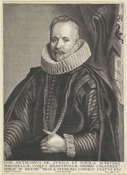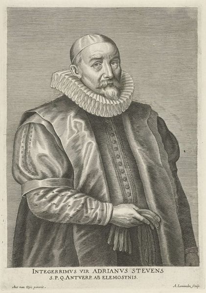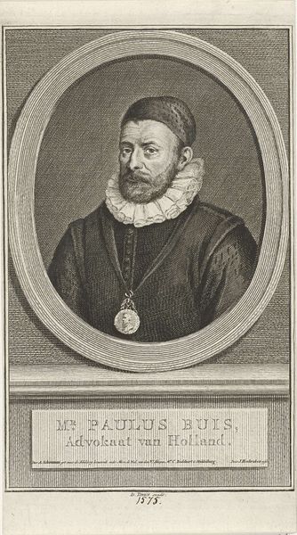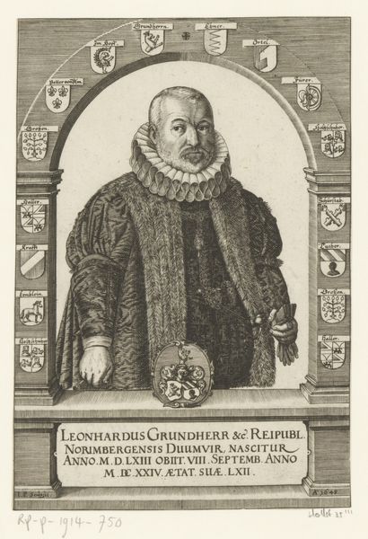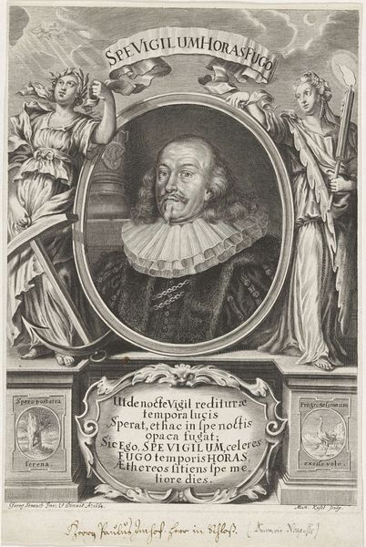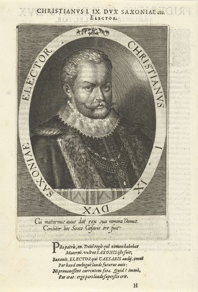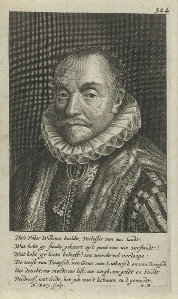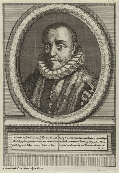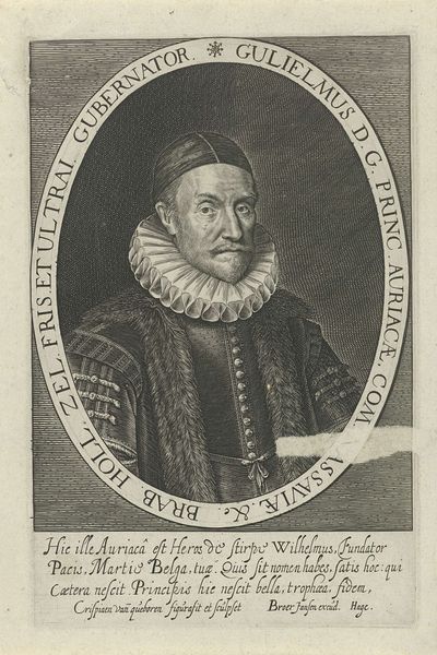 Curator: Here we have Hendrik Bary’s "Portret van Willem I, prins van Oranje," created around 1671, now housed at the Rijksmuseum. It’s an engraving that offers a glimpse into the political and social climate of the Dutch Golden Age, a period defined by intense religious and political conflict. Editor: Wow, even in monochrome, you get a sense of weighty gravitas! His expression, those determined eyes, it speaks volumes...it feels…heroic, even a little world-weary. Curator: Absolutely. Bary situates Willem within a broader narrative of national identity and resistance against oppression. Think about Willem I, the Prince of Orange, as a figurehead of Dutch independence. The engraving functions not merely as a likeness but as a historical document, reinforcing specific ideologies around nationhood, leadership, and religious freedom. The inscription directly addresses Willem and praises him as someone who freed the Dutch from worldly suffering. Editor: And that elaborate ruff, like a starched halo...almost comical today, but then it was all about status. Curator: Precisely. The detailed attire and formal composition place him within a very specific context of power and privilege. And it's worth noting how the style – Baroque and typical of the Dutch Golden Age – would have been interpreted in its time, considering religious and social expectations around portraits, for example. The frame of the engraving, with its detailed scenes, probably illustrates various stages in the Eighty Years' War. Editor: You know, zooming in, I can appreciate the incredible detail of an engraving. You almost forget it’s thousands of tiny lines making up that stern gaze and fluffy fur coat. And it is quite amazing how Bary made an etching turn Willem into something bordering on an icon. Curator: It's a deliberate construction, designed to perpetuate his image as a symbol of resilience against tyranny. Bary utilized established visual languages to engage with contemporary issues of power, religion, and collective memory, while still engaging with historical events through artistry and technical ability. Editor: I’m walking away feeling quite impressed by Willem! I'd always considered the portraits of the royalty somewhat pompous and self-centered. Hendrik Bary’s engraving is definitely on another level, even considering all the historical art facts surrounding its subject. Curator: Exactly. By interrogating its historical roots, this artwork offers a potent commentary that echoes far beyond the Dutch Golden Age and its time.