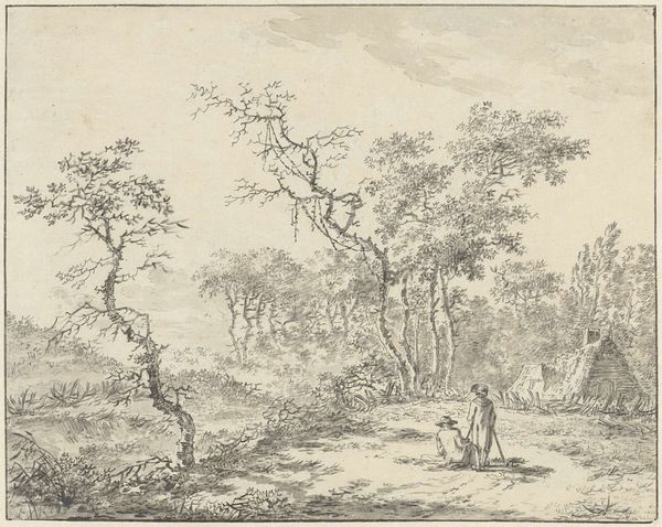Salomon van Ruysdael created this landscape drawing using pen and brown ink. The composition invites our eye into a serene vista, dominated by a softly rendered sky that occupies about half of the picture plane. The artist employs a horizontal format, emphasizing the flatness of the Dutch landscape. Ruysdael uses subtle tonal variations to create depth and distance. Note the placement of figures and trees to guide the viewer's gaze, which is a calculated arrangement meant to structure our experience of the scene. The drawing is more than just a picturesque view; it is an exercise in the poetics of space. Ruysdael explores how we perceive and understand the relationship between ourselves and the land. Observe the lines; how do they define form, create texture, and suggest movement? It is through these formal choices that Ruysdael constructs a landscape that is both visually pleasing and conceptually rich.