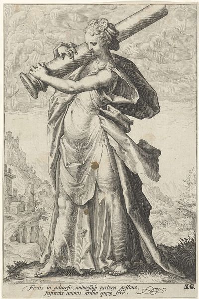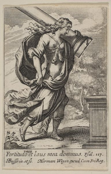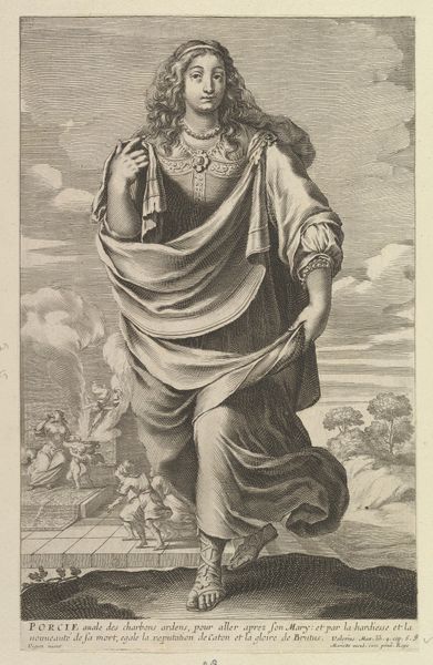 Curator: Gilles Rousselet created this engraving titled "Clélie" in 1647. The print, now housed at the Metropolitan Museum of Art, depicts a figure, presumably Clélie, overseeing a battlefield. What are your immediate impressions? Editor: Well, my first thought is, what a presence! She's looking back, maybe thoughtfully, over this scene of total chaos and conquest below. Her feet look tough and ready for anything. I like that tension of violence happening behind her, contrasted with her kind of poised calm. It feels very charged, don't you think? Curator: Absolutely. Clélie is a Roman figure known for her bravery and virtue. This engraving seems to be capturing a specific moment in her story – where she escapes as a hostage and crosses the Tiber River to return to Rome, thus defying King Porsena and his army. This image would then situate itself within Baroque traditions around representing themes of virtue triumphing over adversity. Editor: Right, because history paintings at the time are all about the symbolism, what values we, the viewers, should extract! Thinking about her positioning in the image, you almost get the sense she is rising above it all, literally. And that landscape below looks almost hellish in a way! You've got this dramatic billowing cloud in the background that could suggest chaos but perhaps signals some divine intervention. Curator: And if we zoom in, Rousselet employs really fine line work to create tonal gradations and textures. That adds depth, giving that background landscape a great atmospheric perspective. It pulls you in even as Clélie stands in the foreground, commanding your attention. The draping and folds in her garments also accentuate movement, suggesting an almost sculptural form despite this work being done on paper. Editor: And isn't it interesting that she is the sole protagonist, but a flurry of small details, especially the many bodies engaged in some battle below, tell this heroic narrative so poignantly? Overall, I love this tension between delicacy and fierceness embodied in her and communicated through this rather fragile medium. Curator: Indeed. Examining Clélie through an intersectional lens helps us consider how power, gender, and visual storytelling converged to solidify historical narratives and promote very specific values. Thanks for unpacking that, that has shifted my perspective. Editor: Absolutely, it works both ways. Thanks to you too. I feel ready to go out there and cross the Tiber myself!