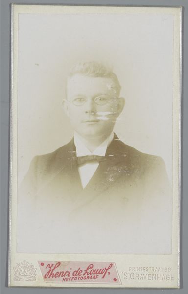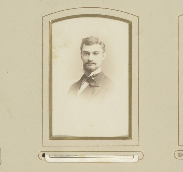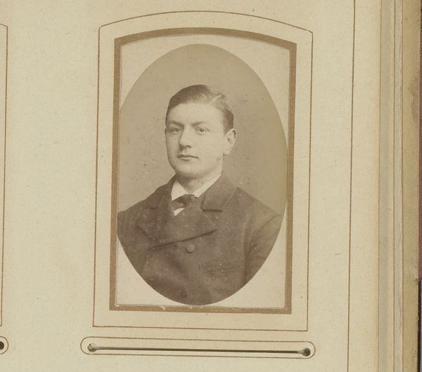 Editor: This is "Portret van een jonge man," a photographic portrait created sometime between 1850 and 1900 by H. Berghäger. The monochromatic palette creates a very stoic, formal feel. I'm curious, what stands out to you most about the formal qualities of this photograph? Curator: Initially, it's the subject's gaze. His eyes possess a sharpness that contrasts with the soft focus characteristic of photography of this era. Examine the tonality: the interplay of light and shadow sculpts his features with subtle gradations. Note how the tight framing accentuates the composition. Editor: Yes, the focus is definitely drawn to the subject’s face. And the sharp details of his attire versus the soft focus of the background makes a statement, right? Curator: Precisely. It presents a fascinating paradox. The crispness of the details—the cut of his jacket, the set of his tie—demands attention. They suggest a meticulous concern with representation and contribute a feeling of self-assuredness. Editor: That’s a really great observation, thank you! Seeing it this way really helps. Curator: It’s about interpreting what we see through formal understanding and analysis. Considering how the various elements relate to one another brings new meaning to the whole image. Editor: Absolutely. This close observation has shifted my perception; now I appreciate the subtleties even more. Thank you.